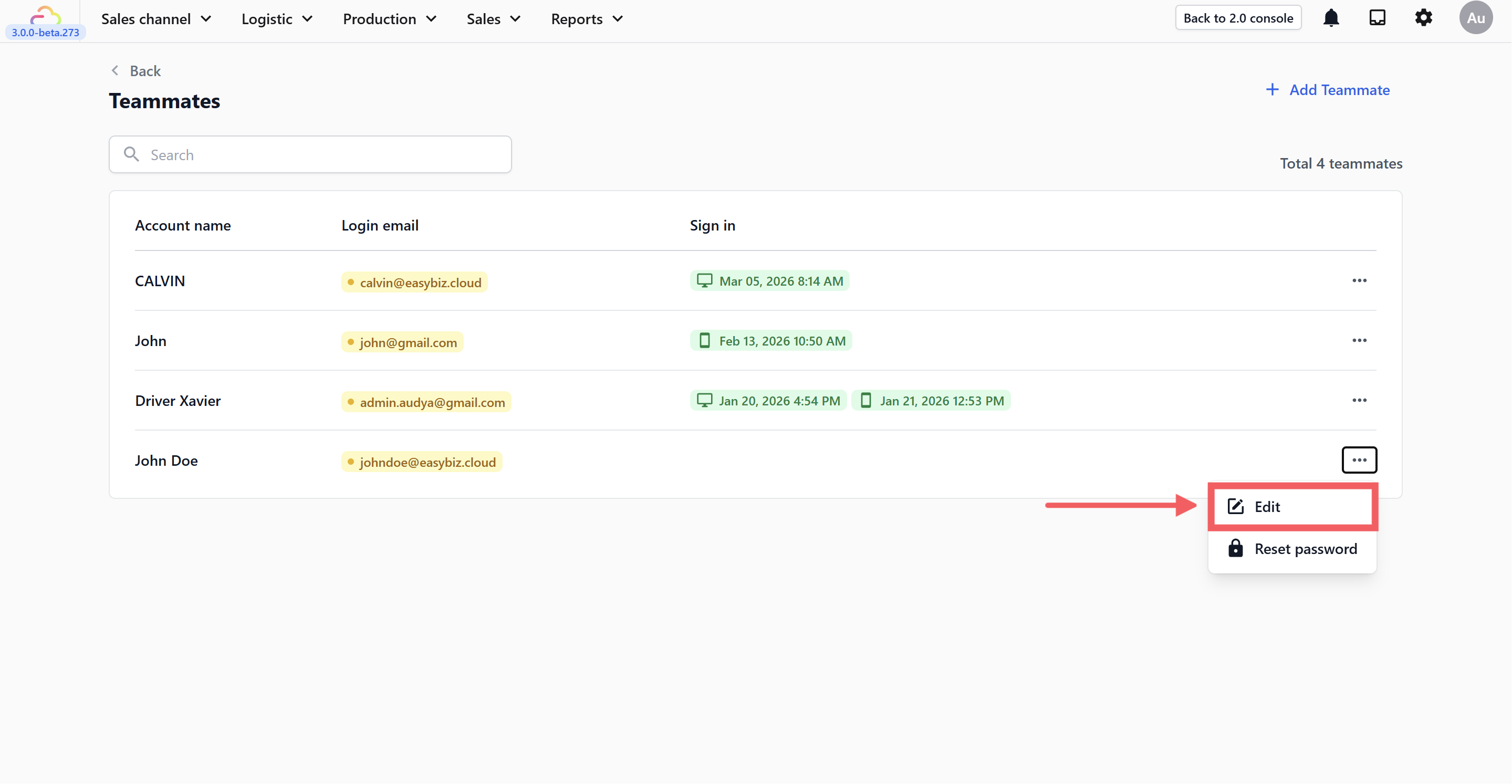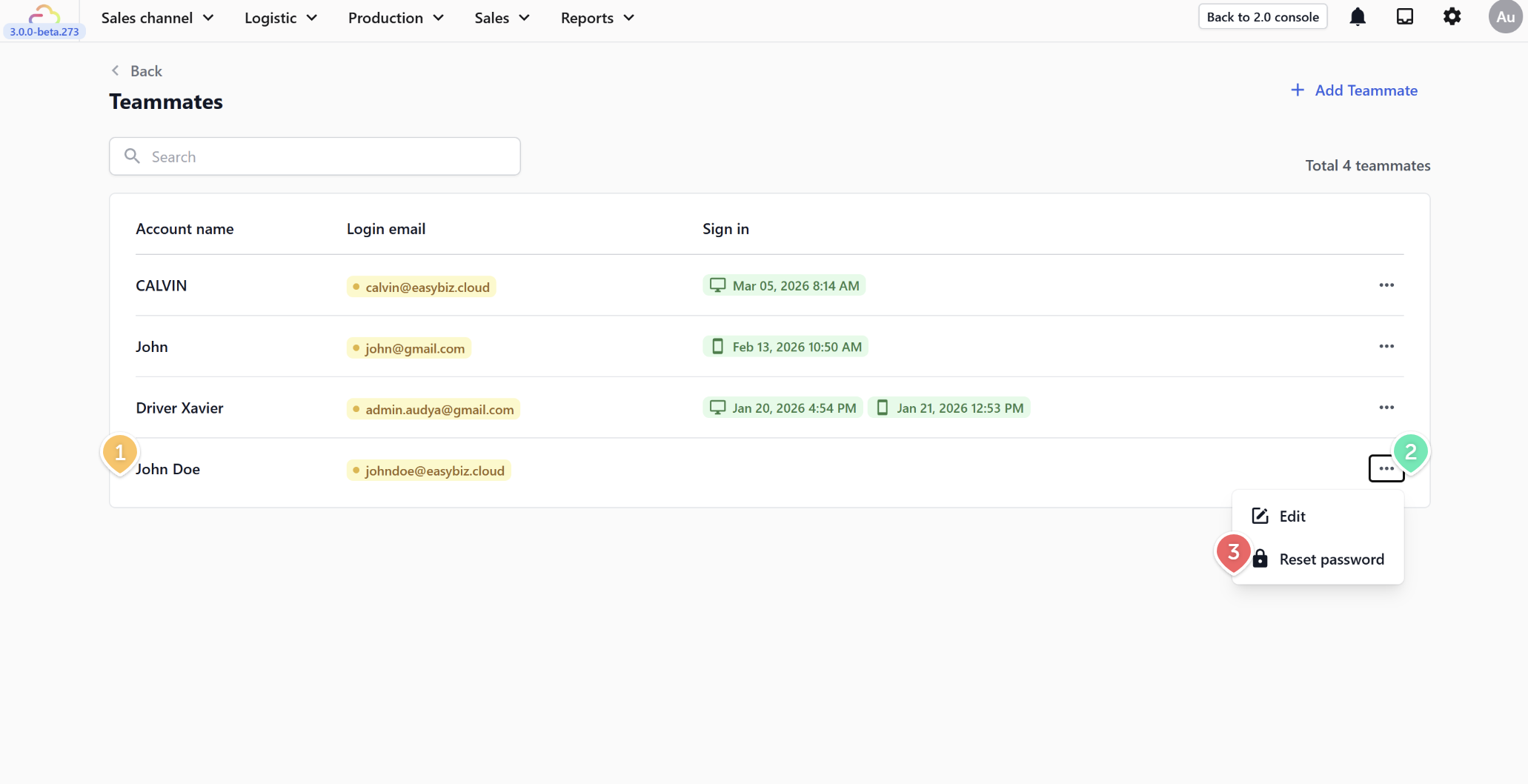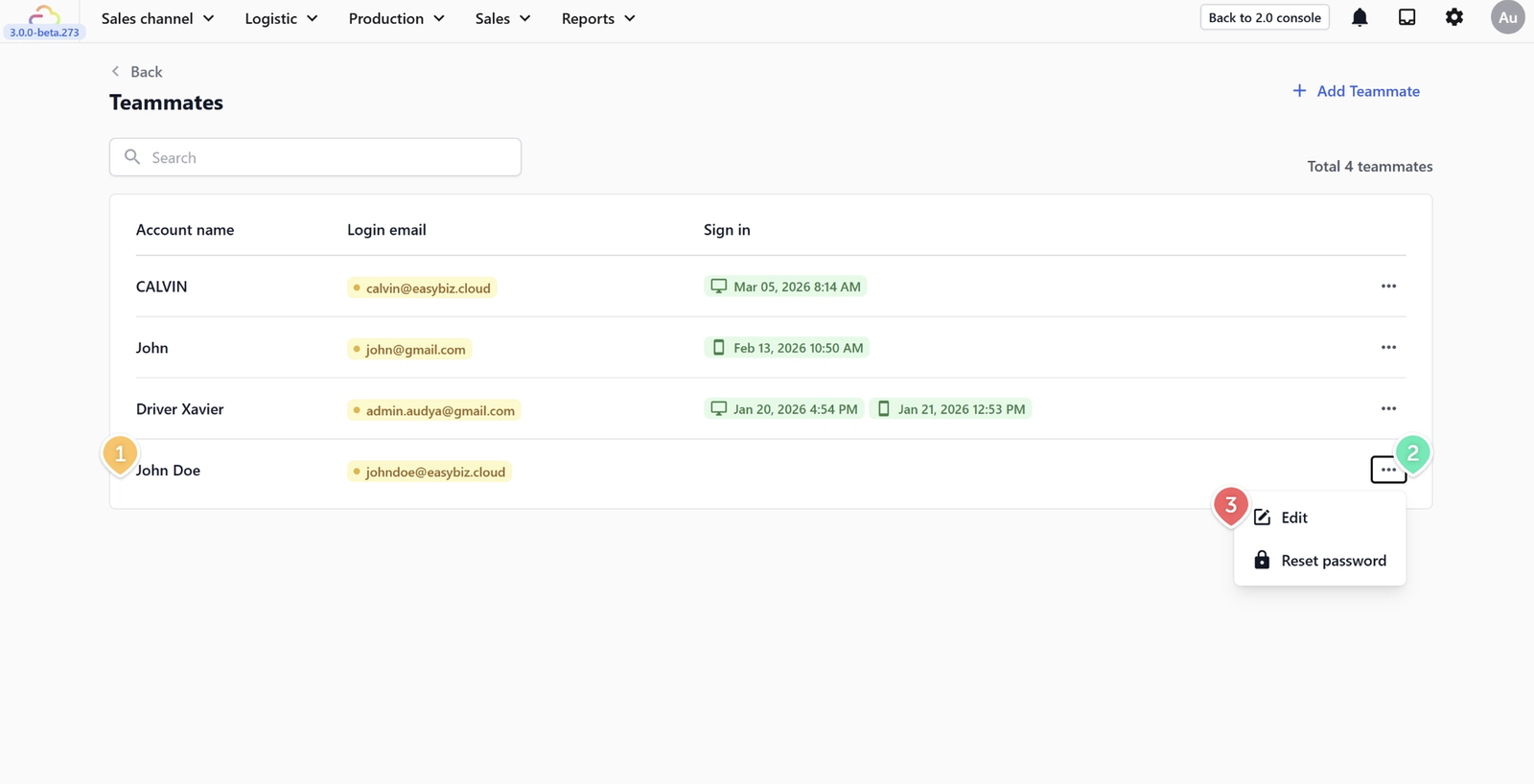 Add team members to your EasyBiz account, manage their details, and control their login credentials — all from one place. Each teammate gets their own login account, so you can track who signed in and when, and you can manage what each person has access to individually. This guide covers how to add new teammates, make changes to existing accounts, reset passwords, and remove accounts when needed.