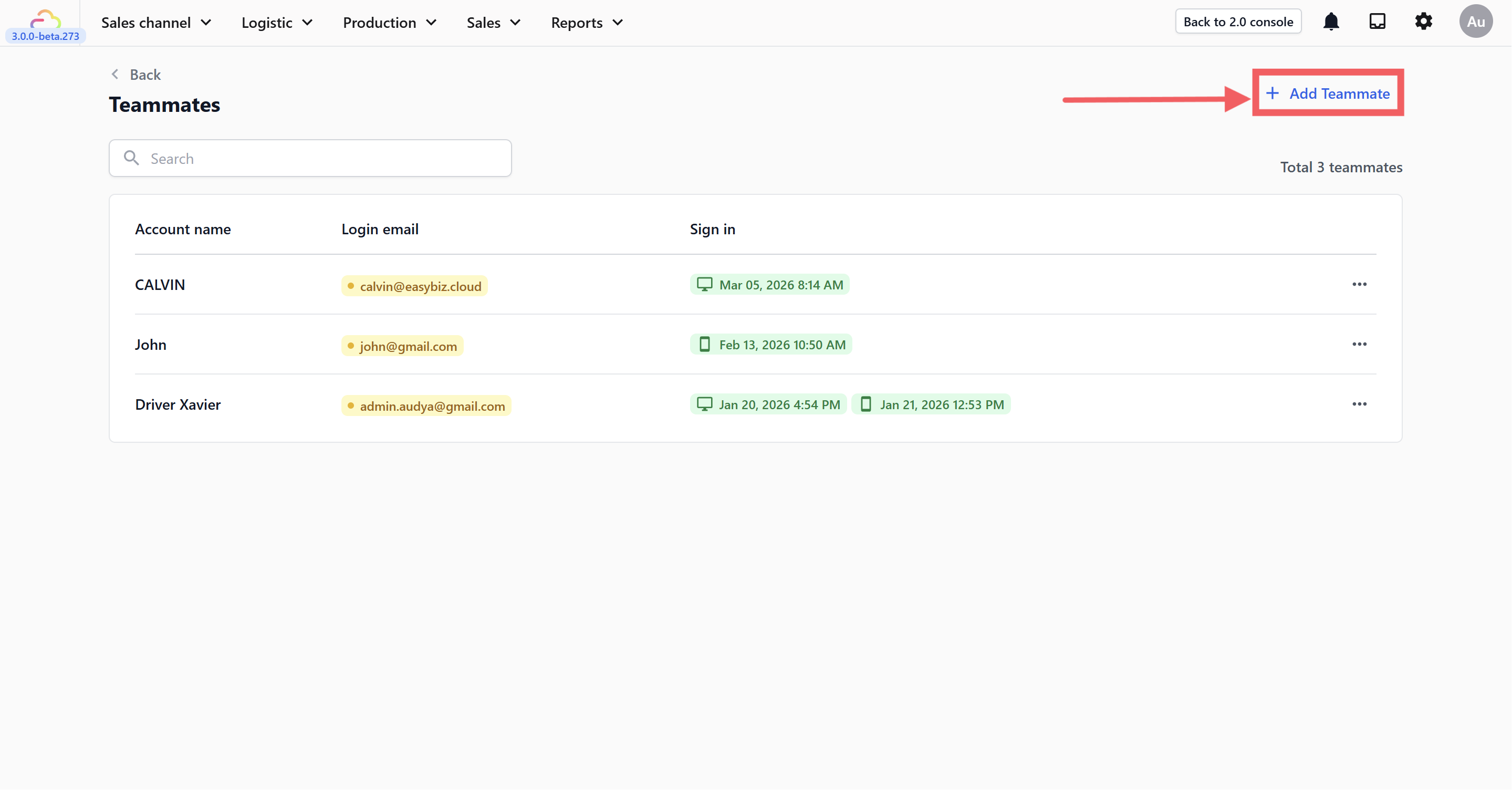 You'll see a list of all teammate accounts, including their account name, login email, and last sign-in dates (for both console and mobile).