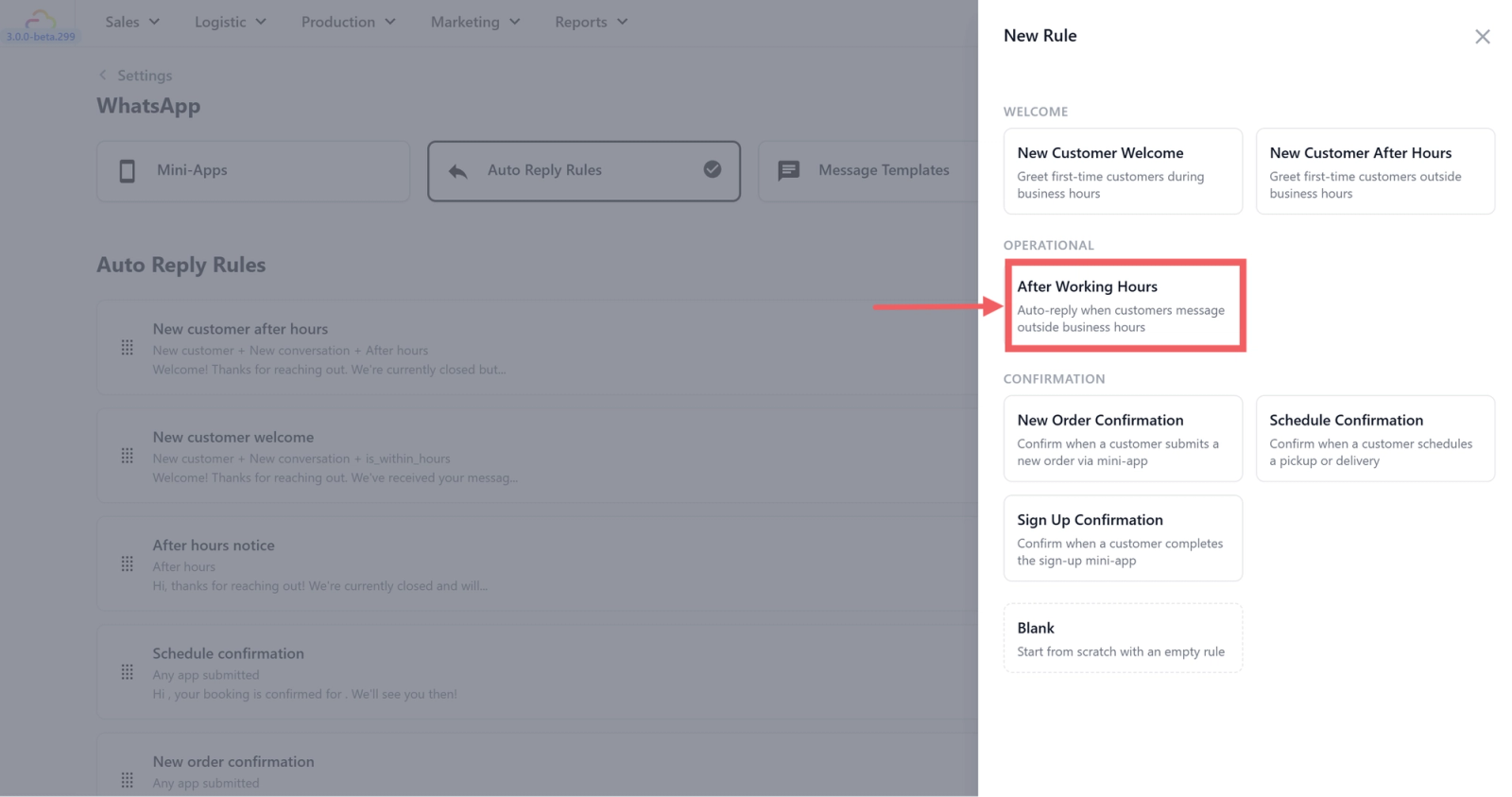 - Go to WhatsApp Settings > Auto Reply Rules tab