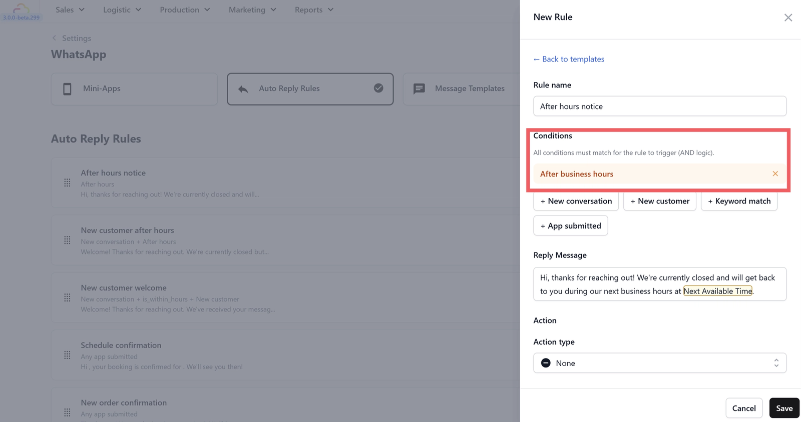 - Business Hours must be enabled and configured in WhatsApp General Settings. This rule uses the "After business hours" condition.