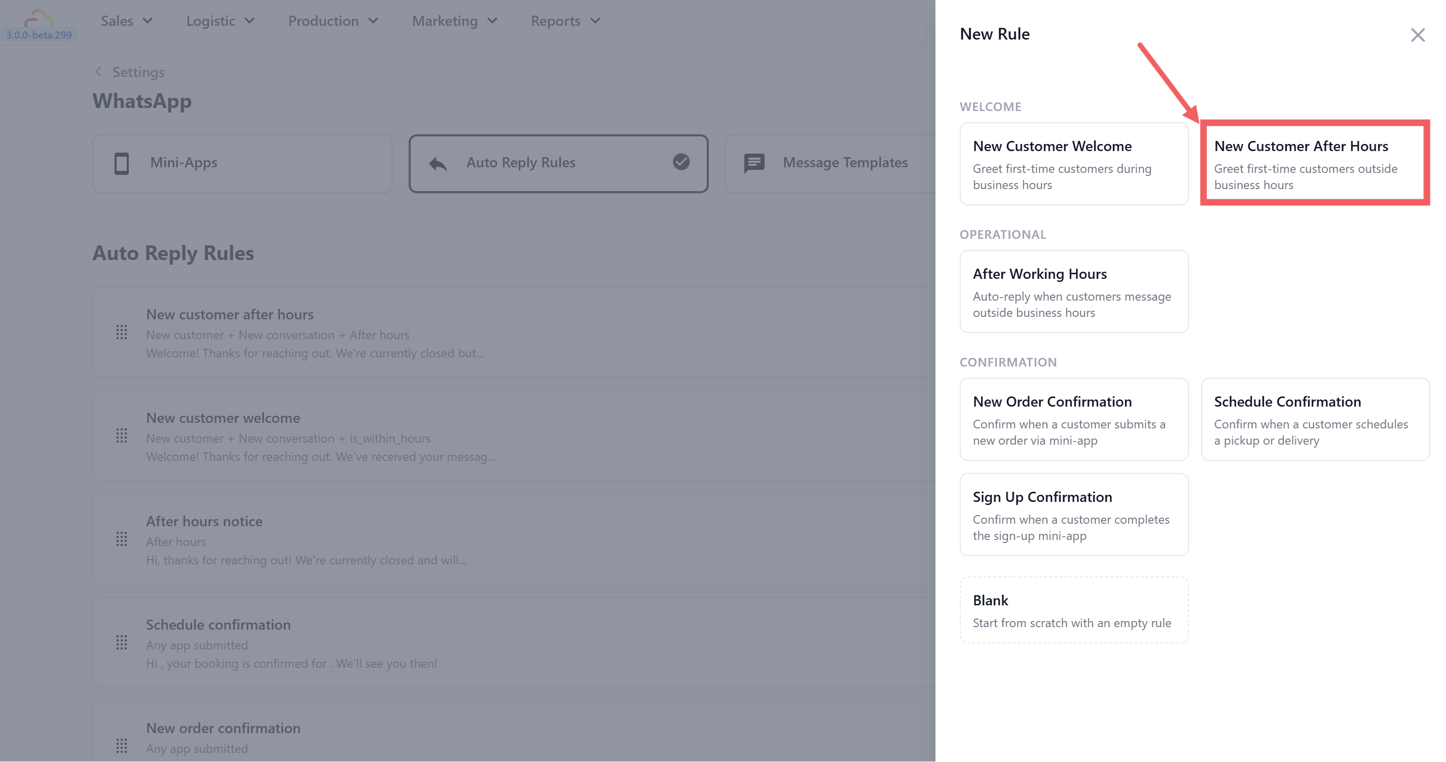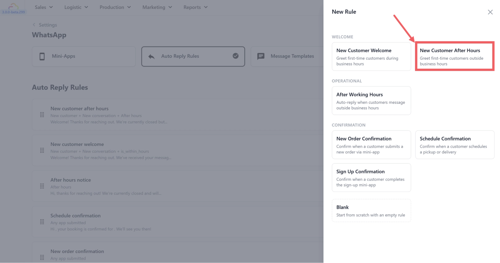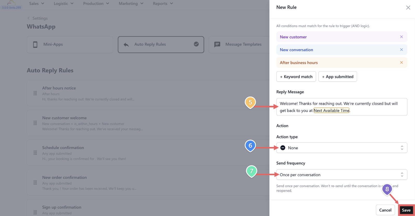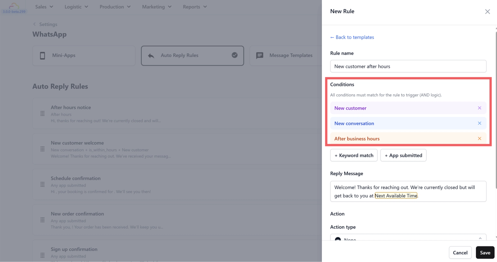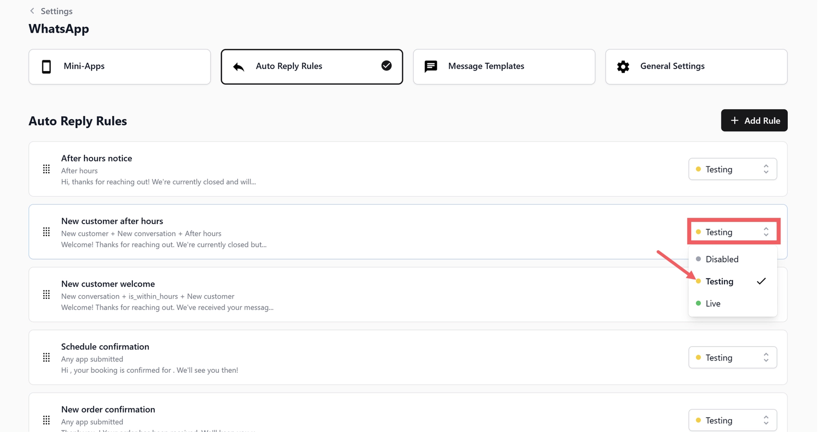 - Go to WhatsApp Settings > Auto Reply Rules tab