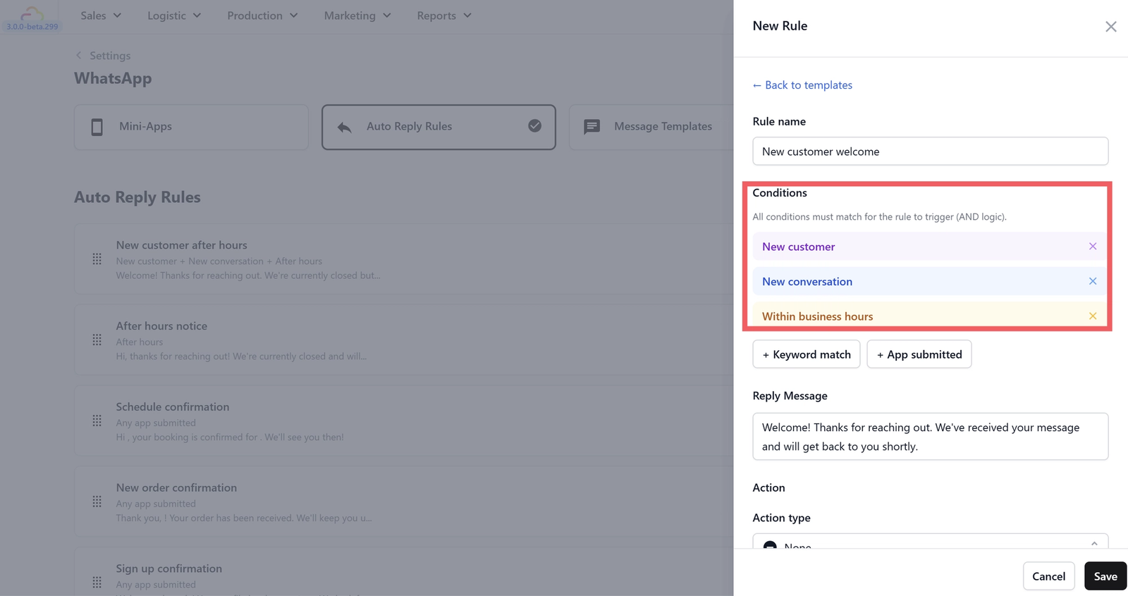 When a new customer messages your business on WhatsApp for the first time, a fast reply sets the tone. This rule sends an automatic welcome message during your business hours — so every first-time customer gets an instant, professional greeting without your team having to drop what they are doing.