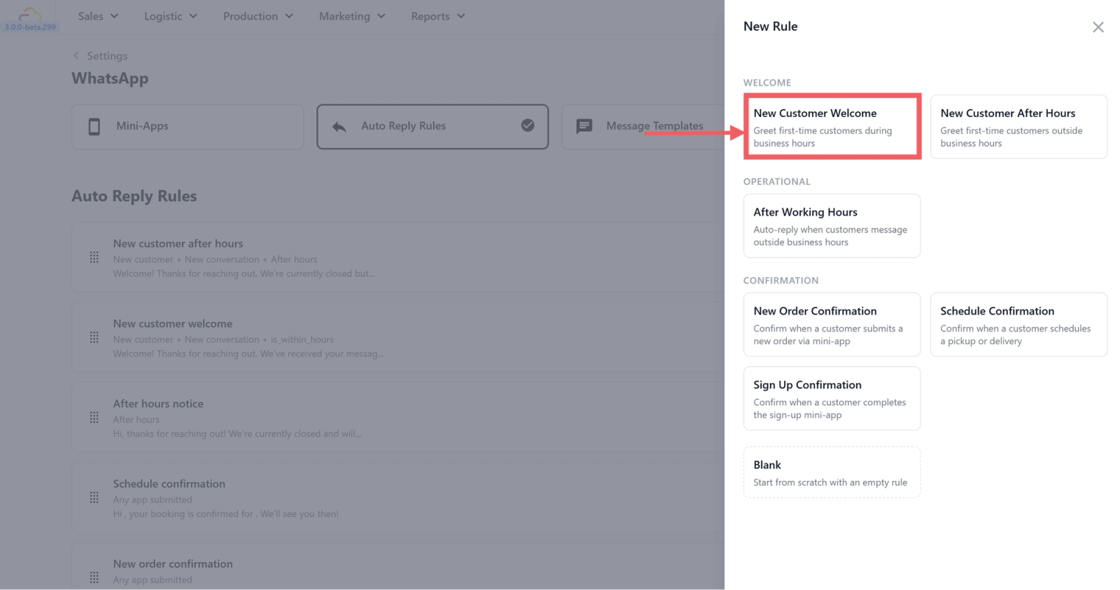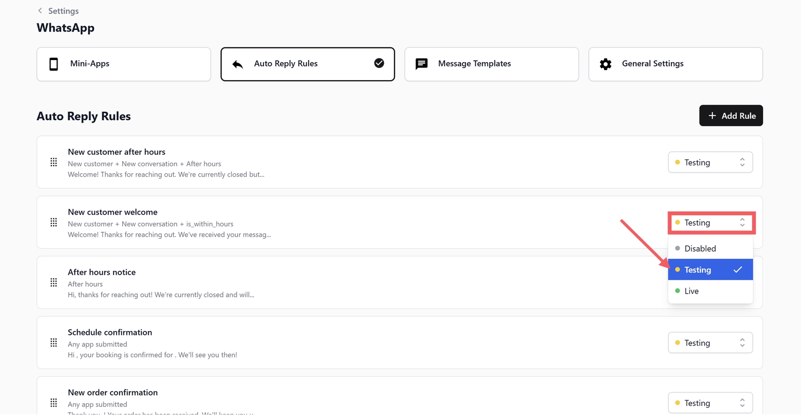 - Go to WhatsApp Settings > Auto Reply Rules tab