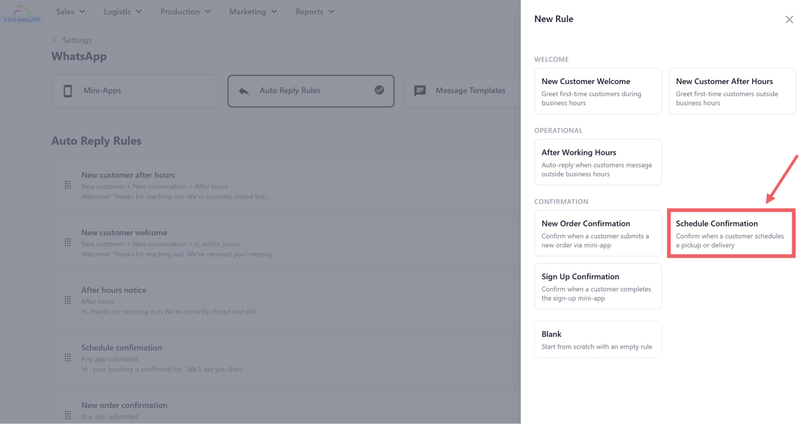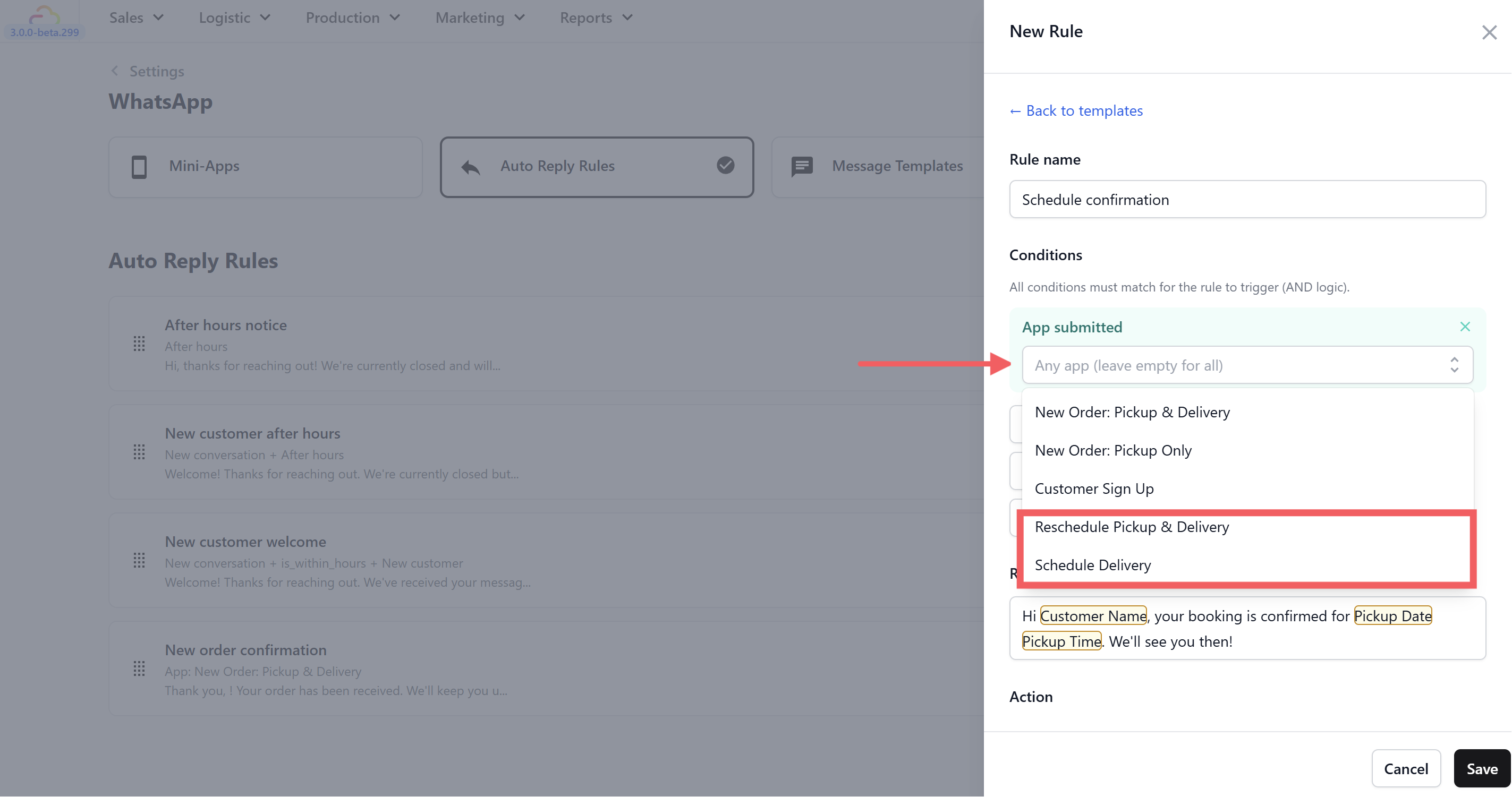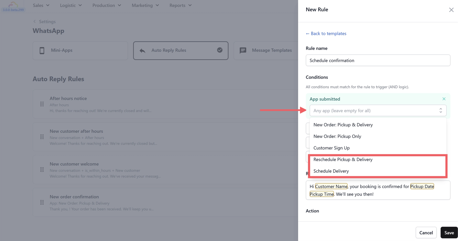 When a customer books a pickup or delivery through your WhatsApp Mini App, they want to know the date and time are locked in. This rule sends an instant confirmation with their scheduled details — so they can plan their day and your team has one less message to send manually.
