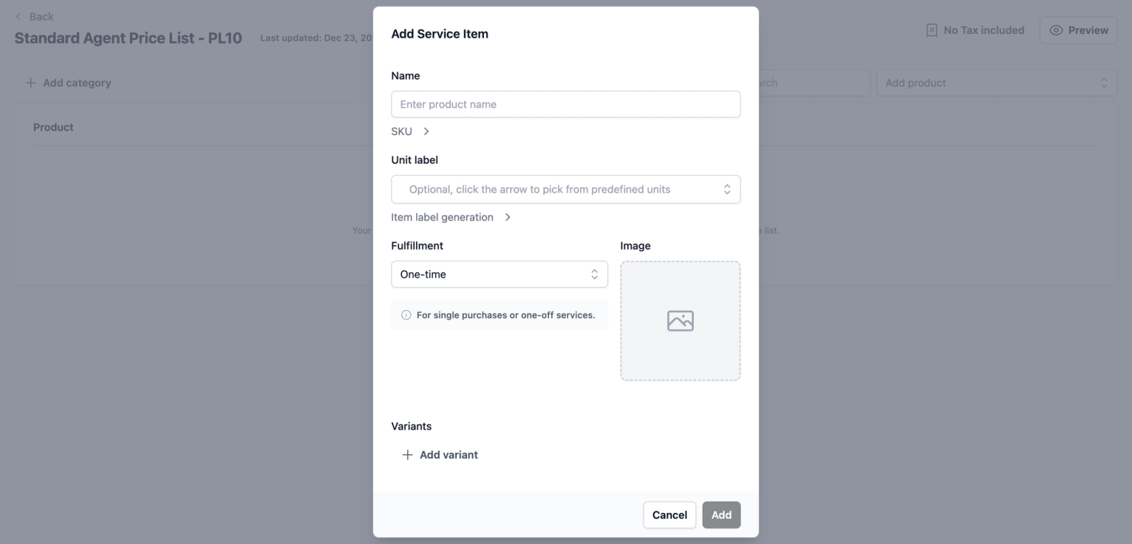 2. Configure Item Details: Click on your preferred option. If you select a new service item or product, a pop-up form will appear for you to configure the details of your new product. For this example, we will add a new item.