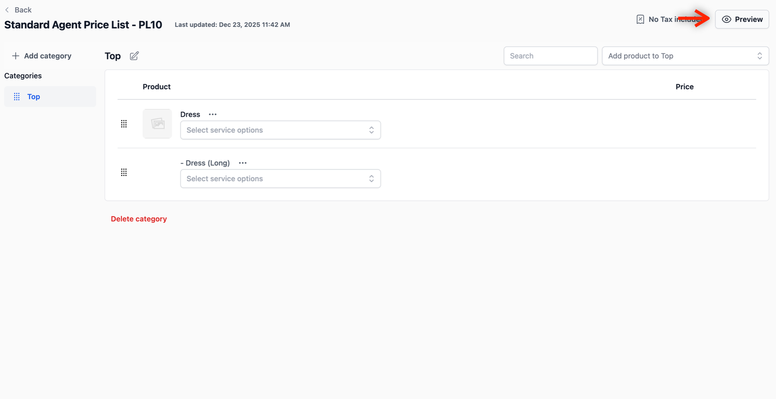 First, click on the Preview button. This allows you to review the list and ensure all product or service items appear exactly as intended.