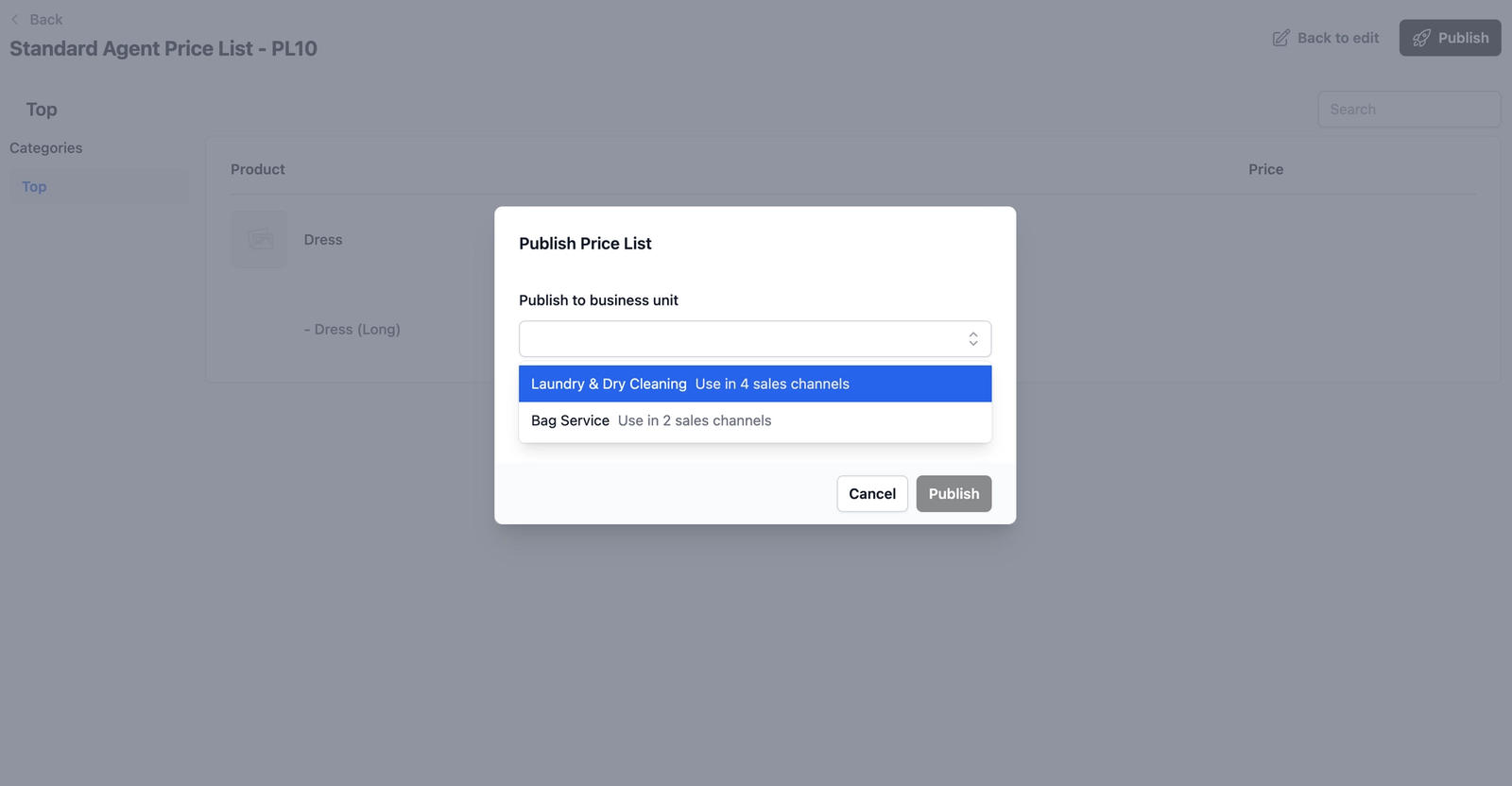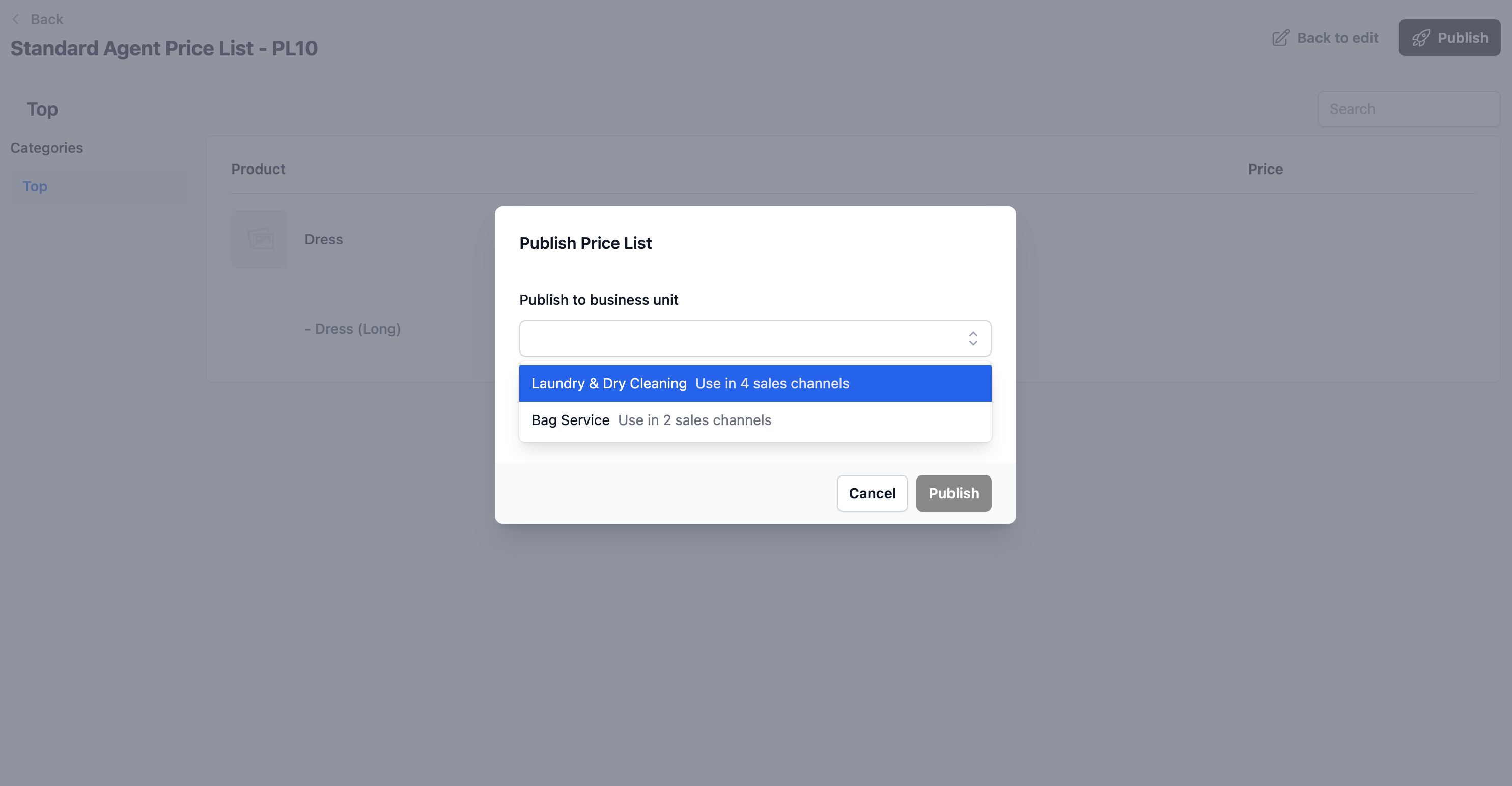 A small pop-up form will appear. Select which Business Unit(s) you would like this agent price list to be published at. This ensures the pricing is applied to that specific business unit.