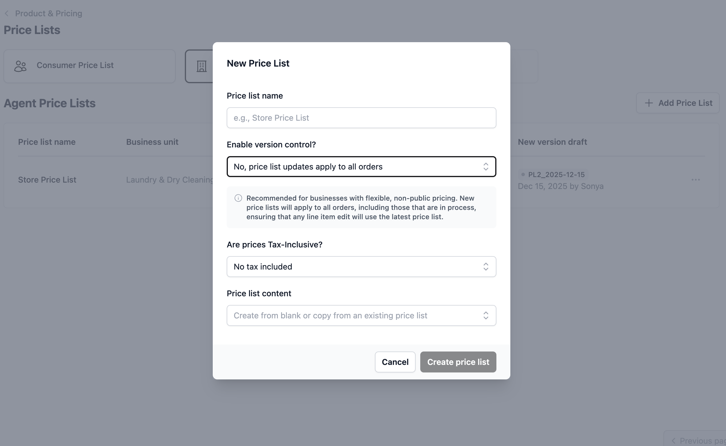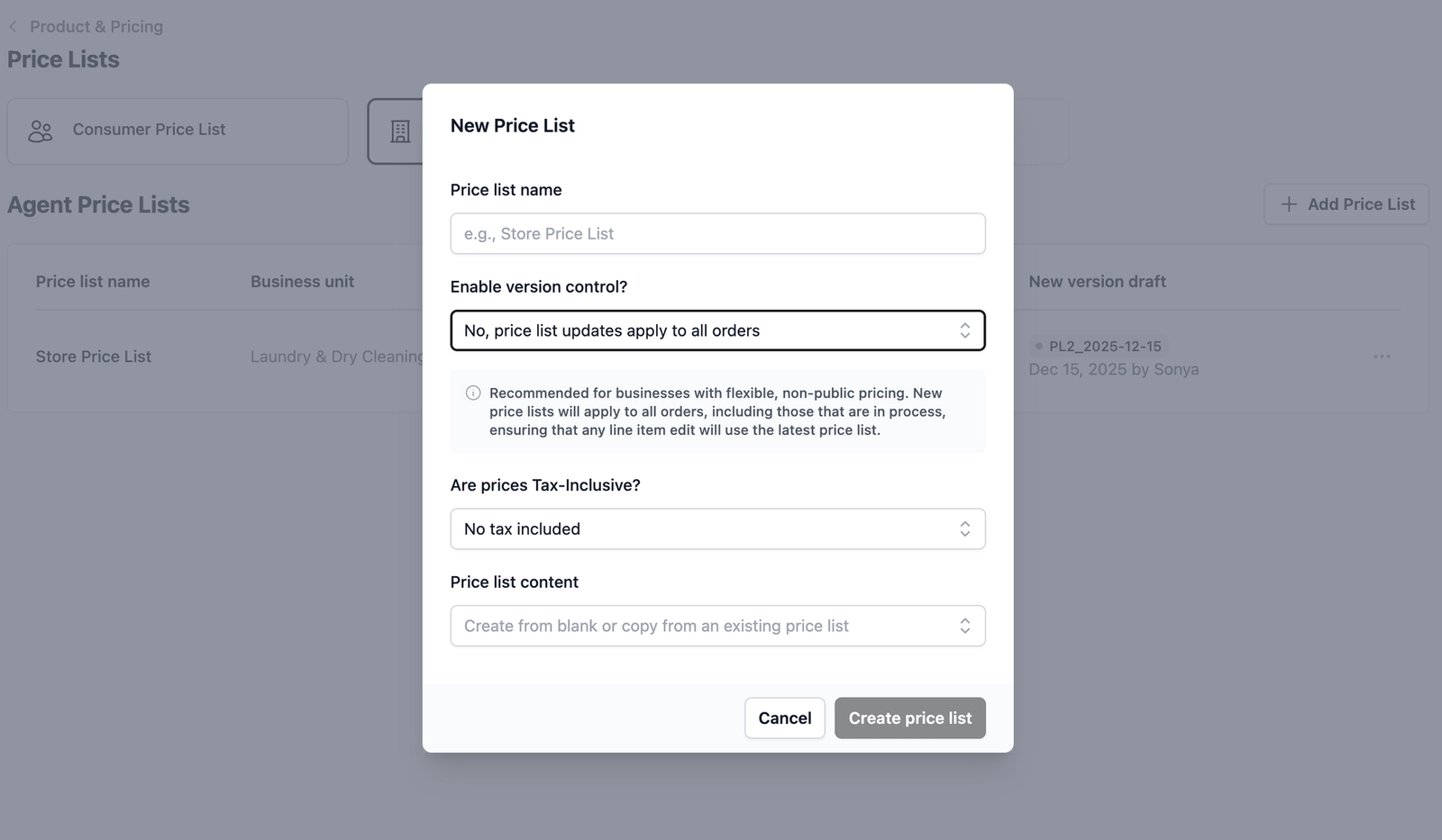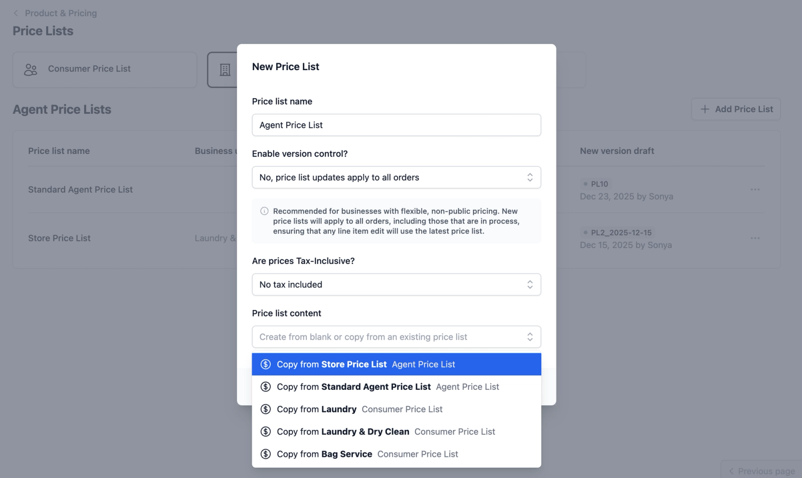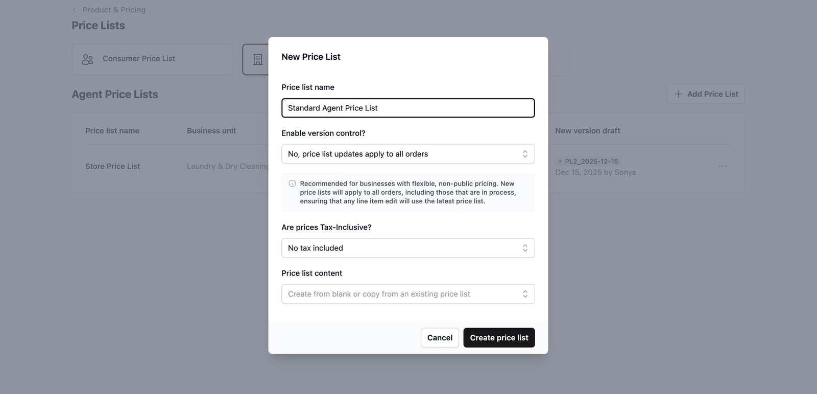Establishing your agent price list is the foundation of your B2B workflow. In this section, we will walk through creating a price list from scratch and how to save time by duplicating an existing one. This ensures every order pulls the correct negotiated rates automatically.