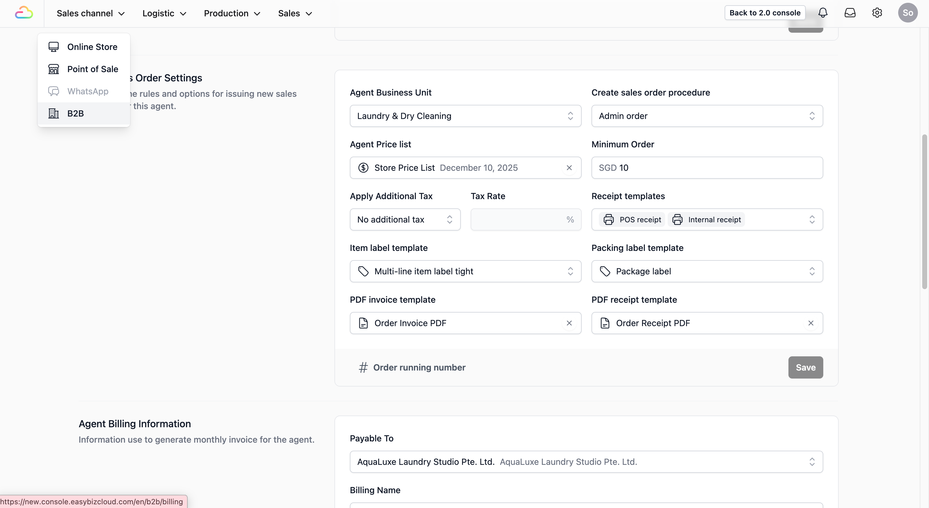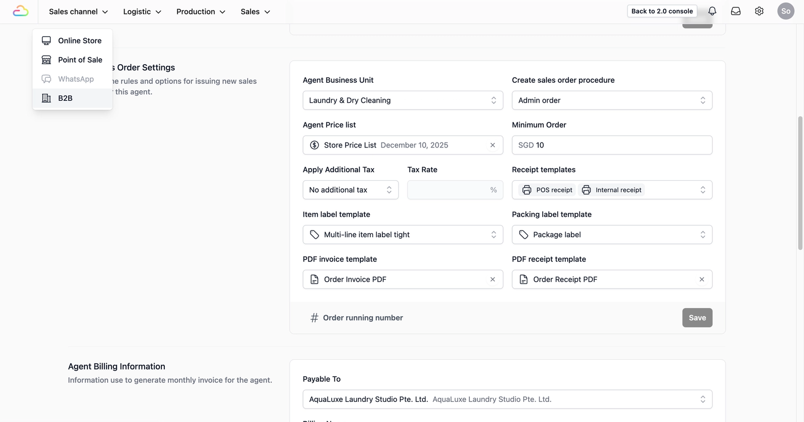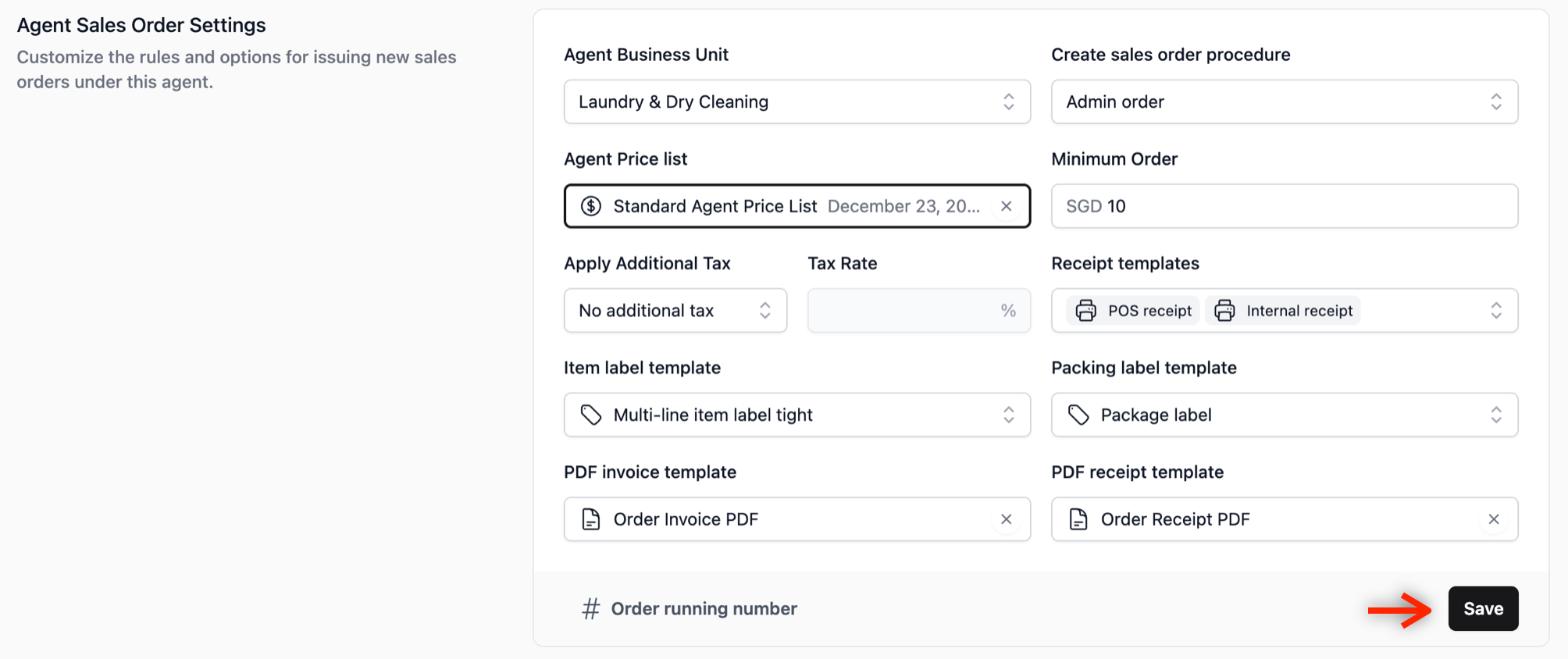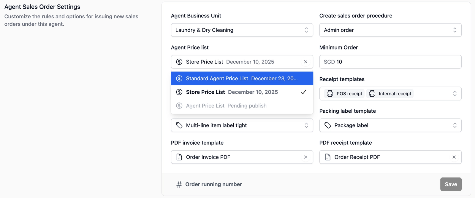 Scroll down the profile page until you locate the Agent Sales Order Settings section. Under the Agent Price List field, click the dropdown box and select your newly created agent price list.