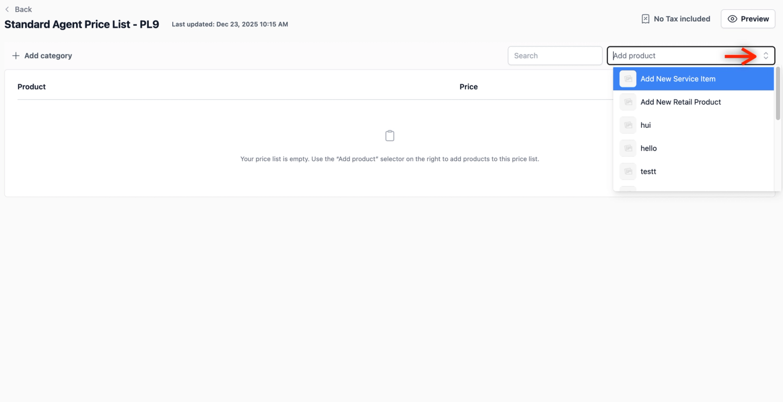 1. Select Item Type: In the editor, click the dropdown button to choose your item. You can select a new service item, new retail product, or an existing product.