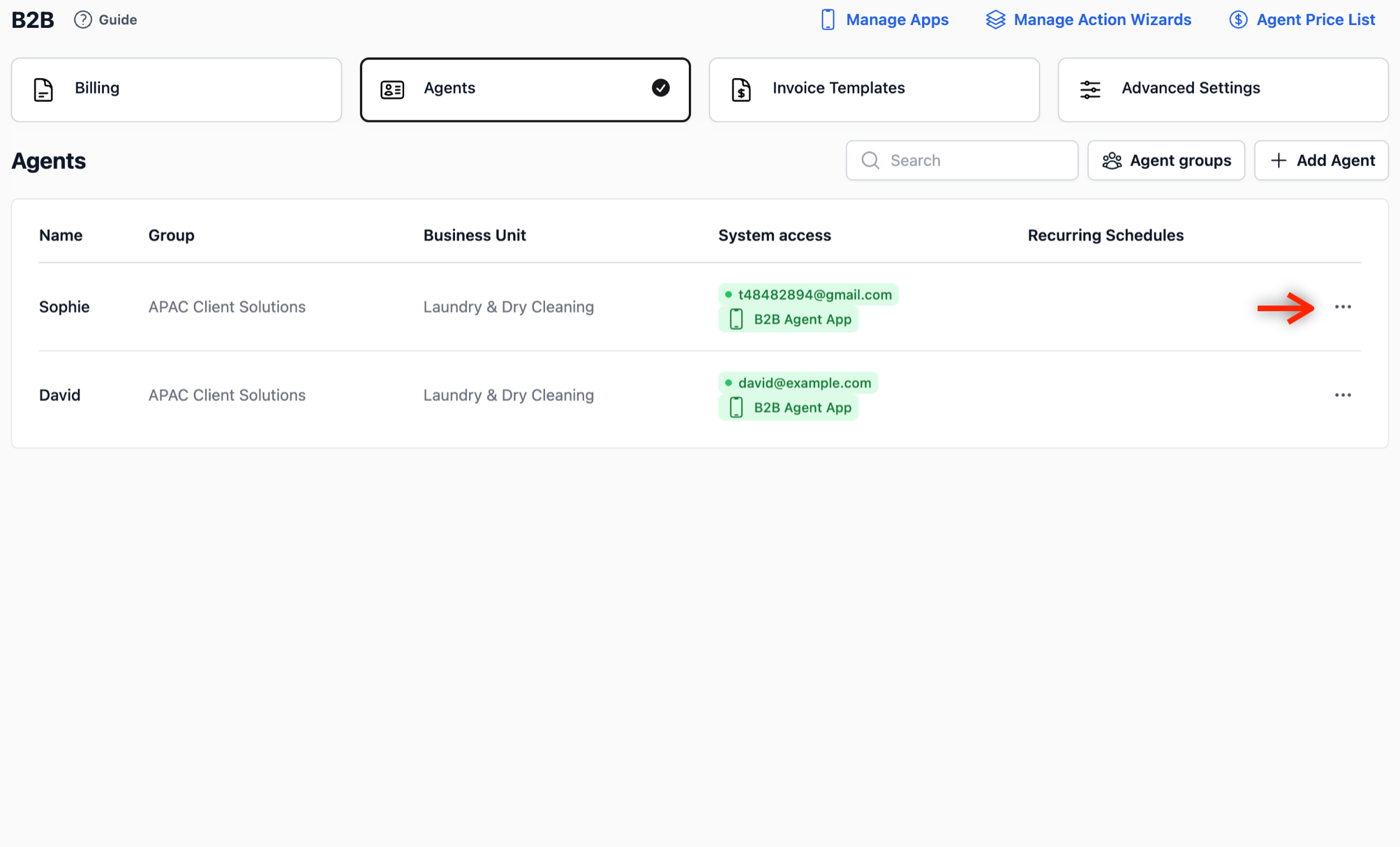 Once you are on the B2B page, click on the Agents tab to view your full list of registered agents. In the table view, locate the agent you want to apply the new agent price list to and click on the ••• (Action Menu) on the far right, and select Edit.