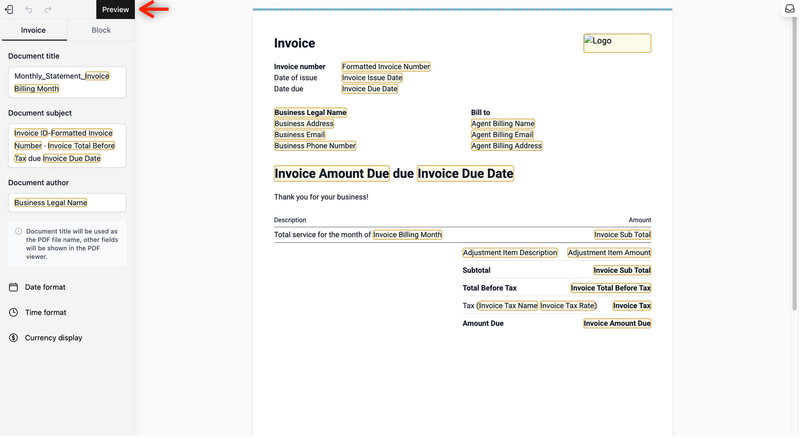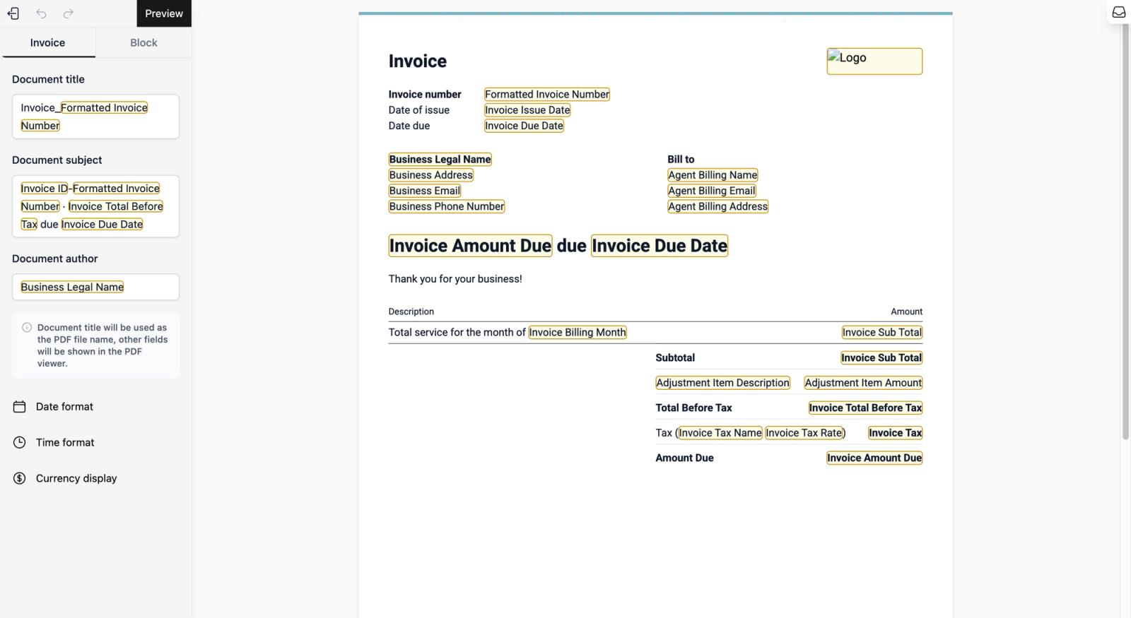- Visual Editor (Left): This controls the high-level "logic" and metadata of your invoice. You can customise the Document Title (which serves as the PDF file name), the Document Subject, and the Document Author. You can also set your preferred Date, Time, and Currency formats to match your business standards.