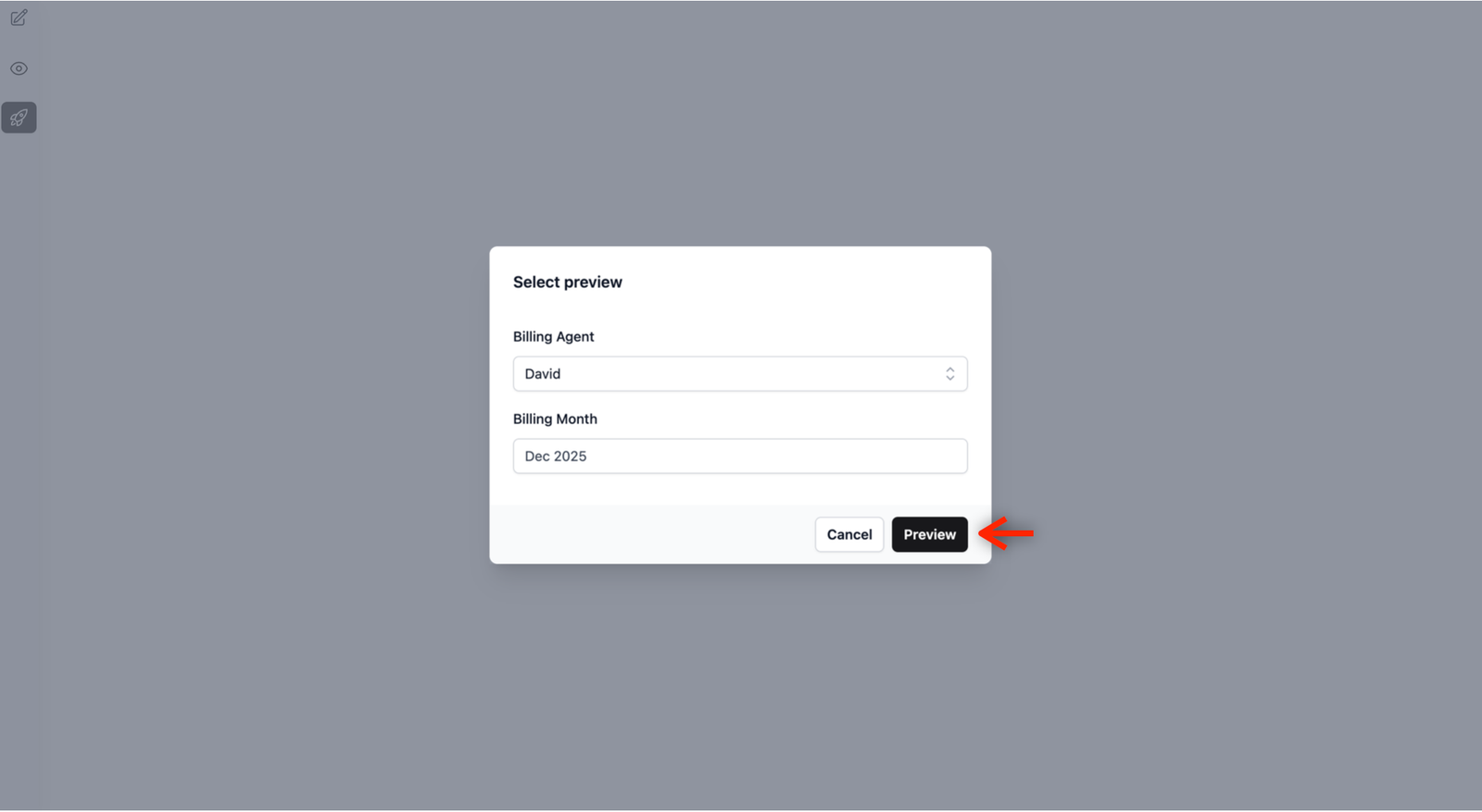 - In the pop-up, select the agent you would like to see this preview on under Billing Agent and choose a Billing Month.