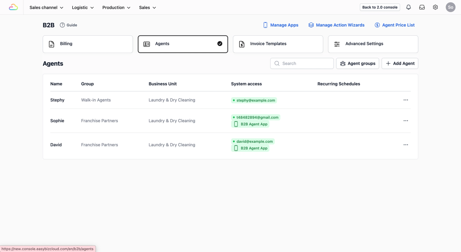 - From home screen: On the top navigation bar, click on Sales Channel.Select B2B from the dropdown menu. In the B2B page, click on the Agents tab.