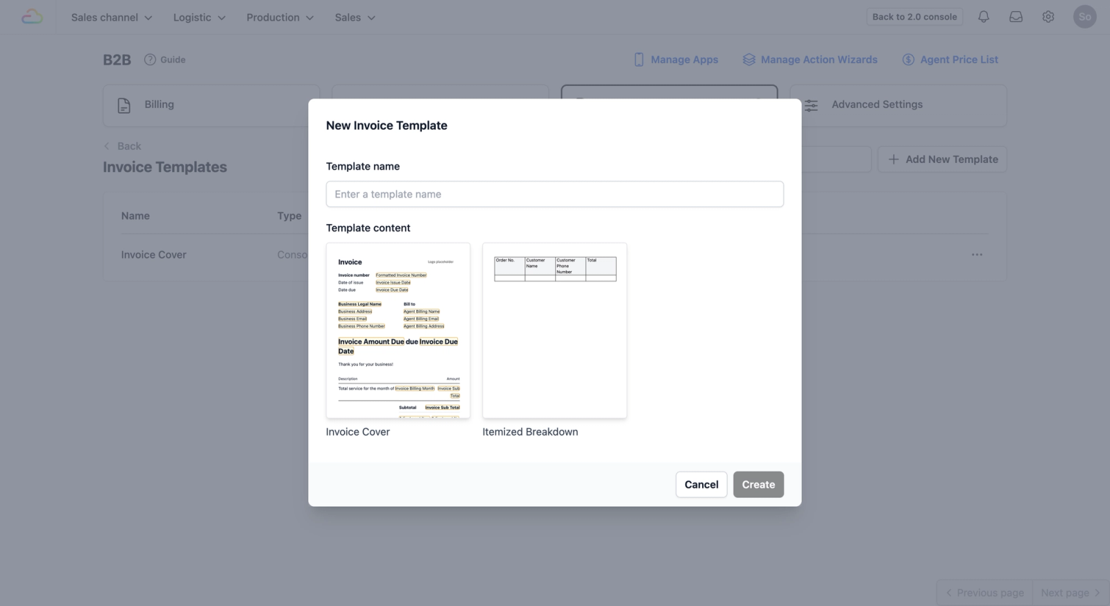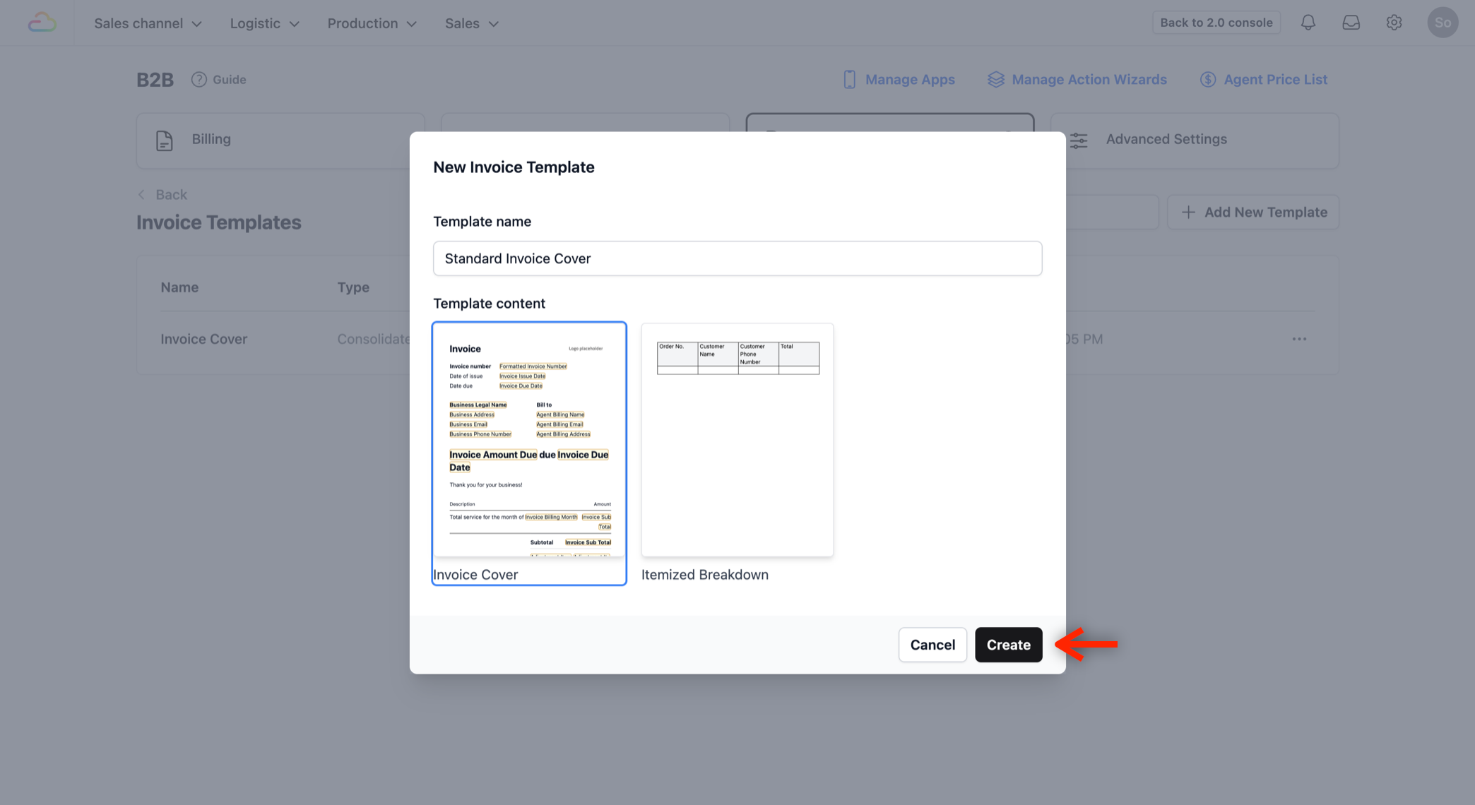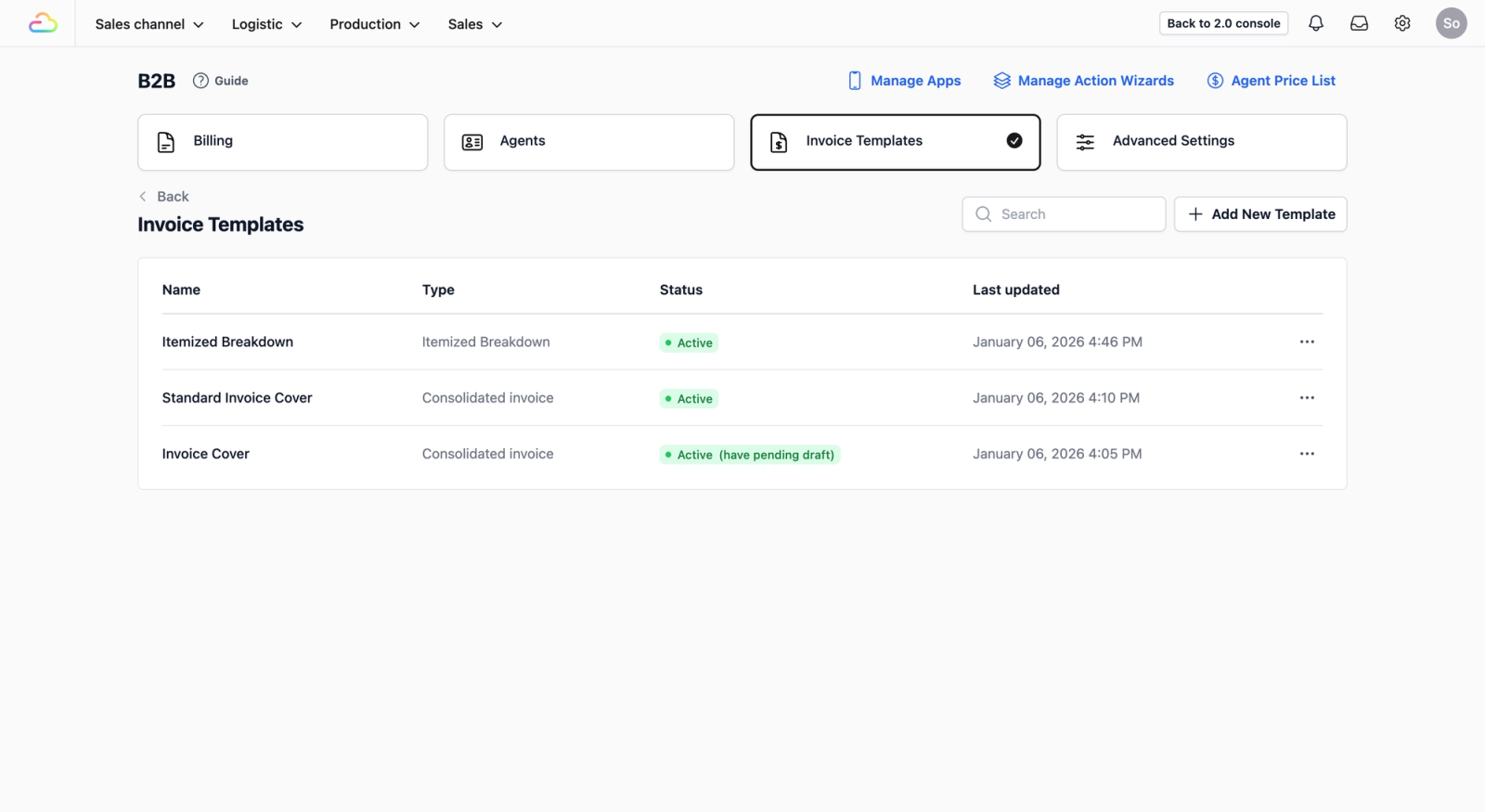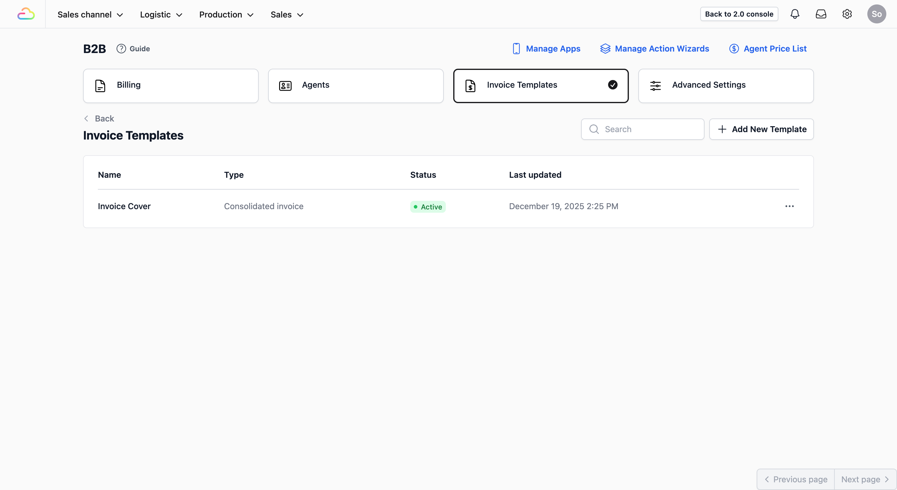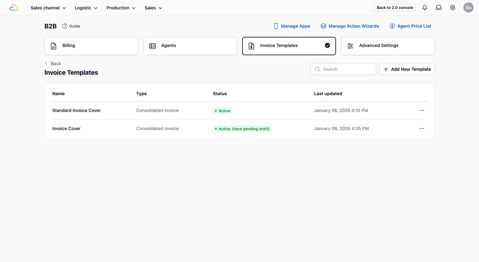Once the B2B page loads, you will see several options at the top. Click on the Invoice Templates tab. This is where you will manage the invoices you send to your agents at the end of each month.