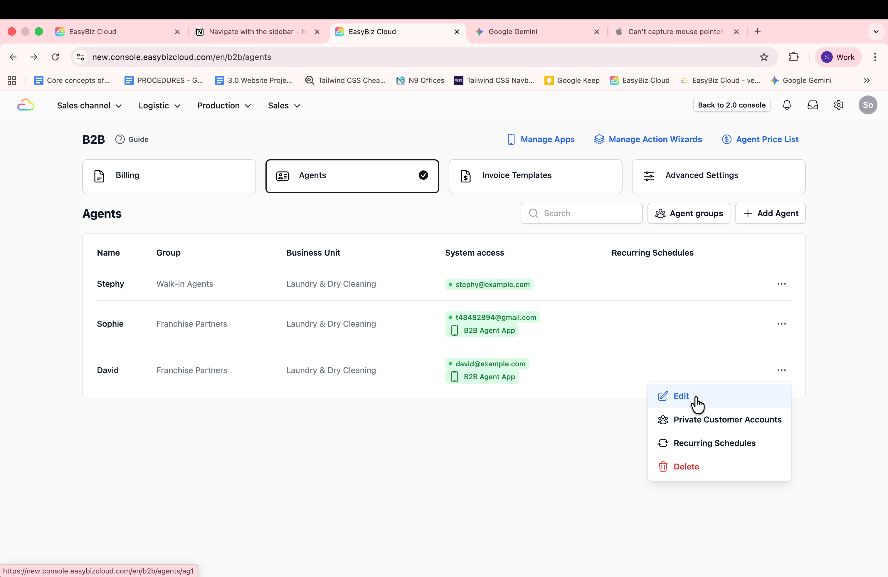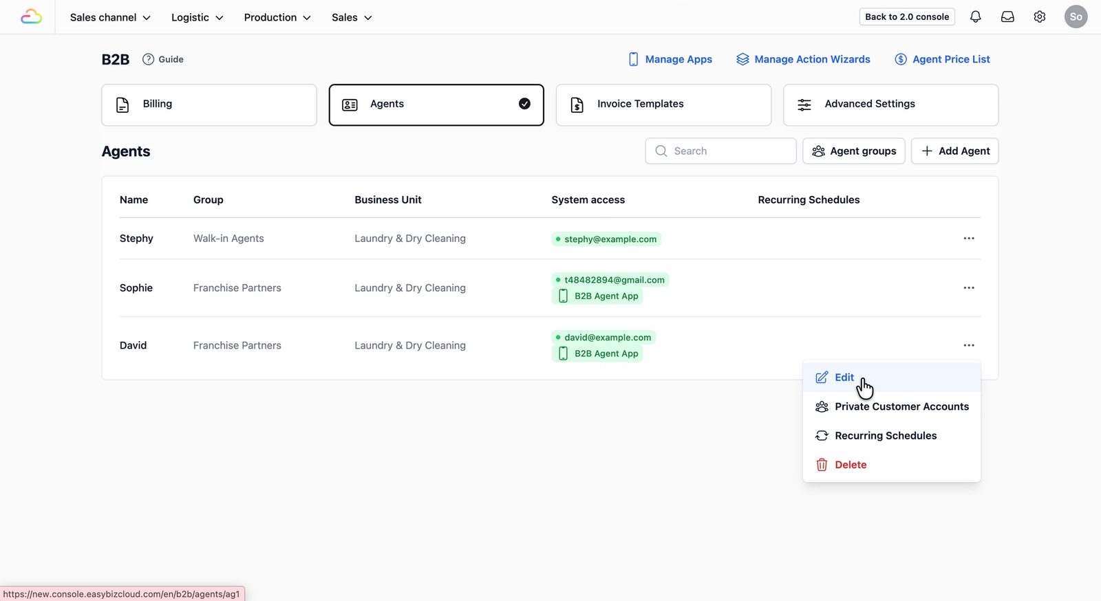 Click on the Agents tab to view your full list of registered agents. In the table view, locate the agent you want to apply the newly created invoice templates to and click on the ••• (Action Menu) on the far right, and select Edit.