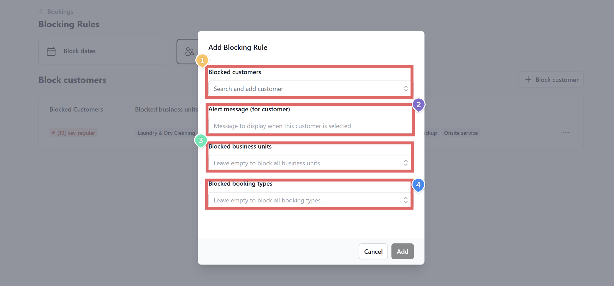 Blocking Customers prevent selected customers from creating new bookings. This is useful for managing exceptional cases such as account reviews, policy enforcement, or restricted access.