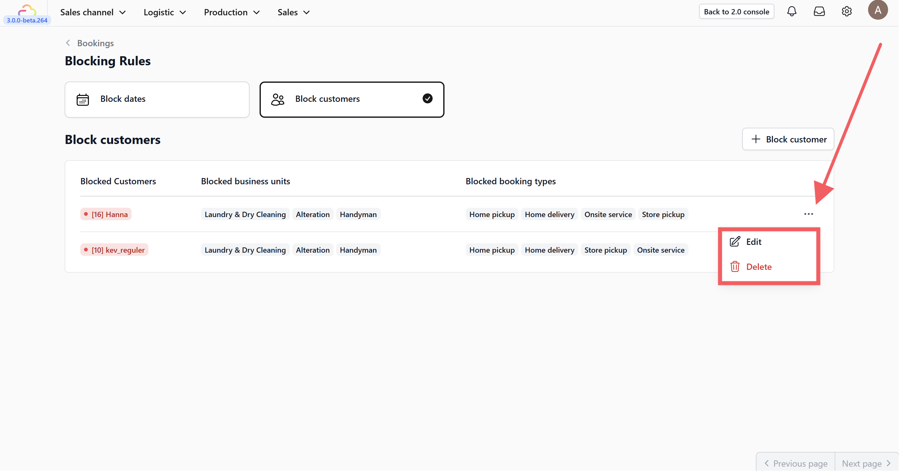 6. Use the three-dot menu to edit or delete an existing blocked customer.