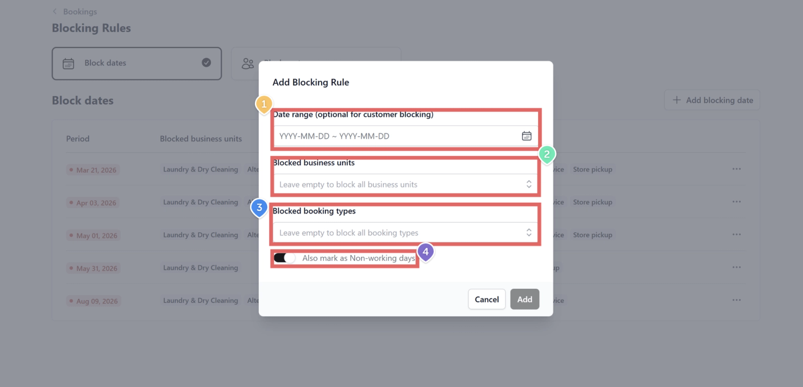 Blocking Dates prevent bookings from being created on selected dates or within a defined date range. This is commonly used for public holidays, maintenance periods, or temporary service closures.