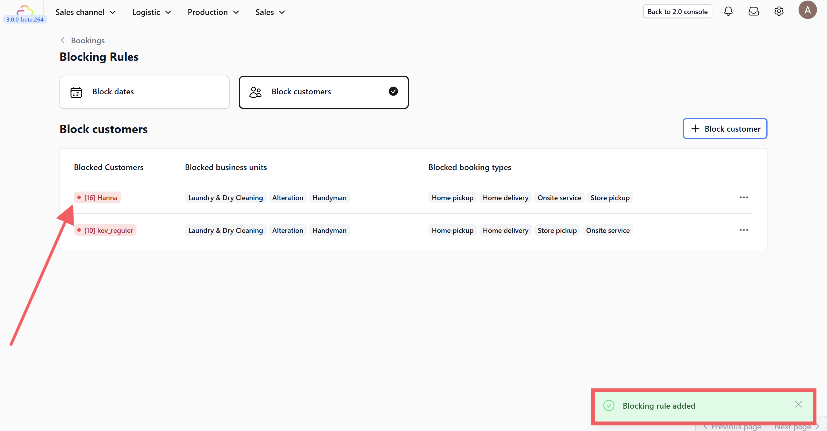 5. You will see a notification confirming that the blocked customer has been added.