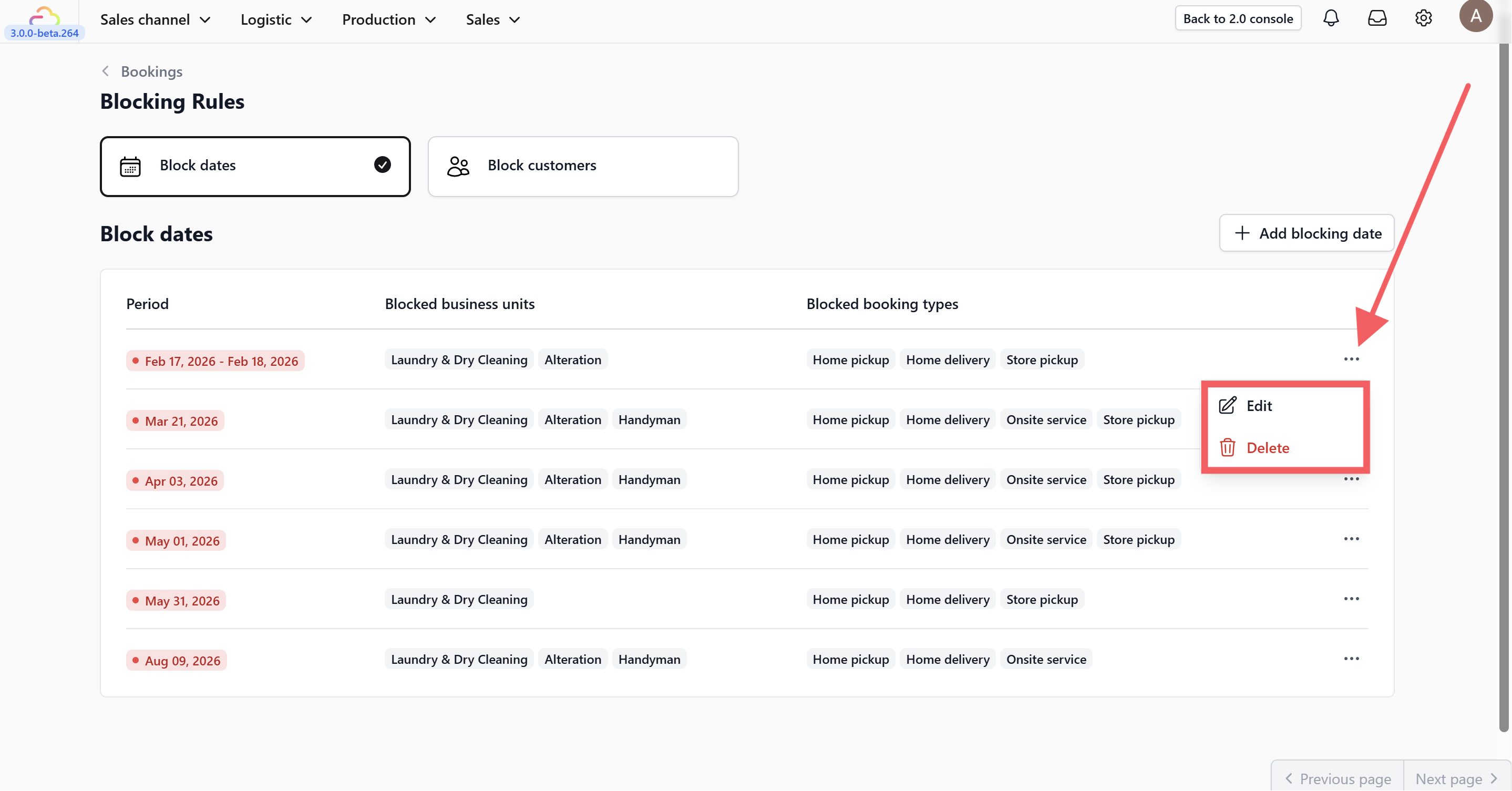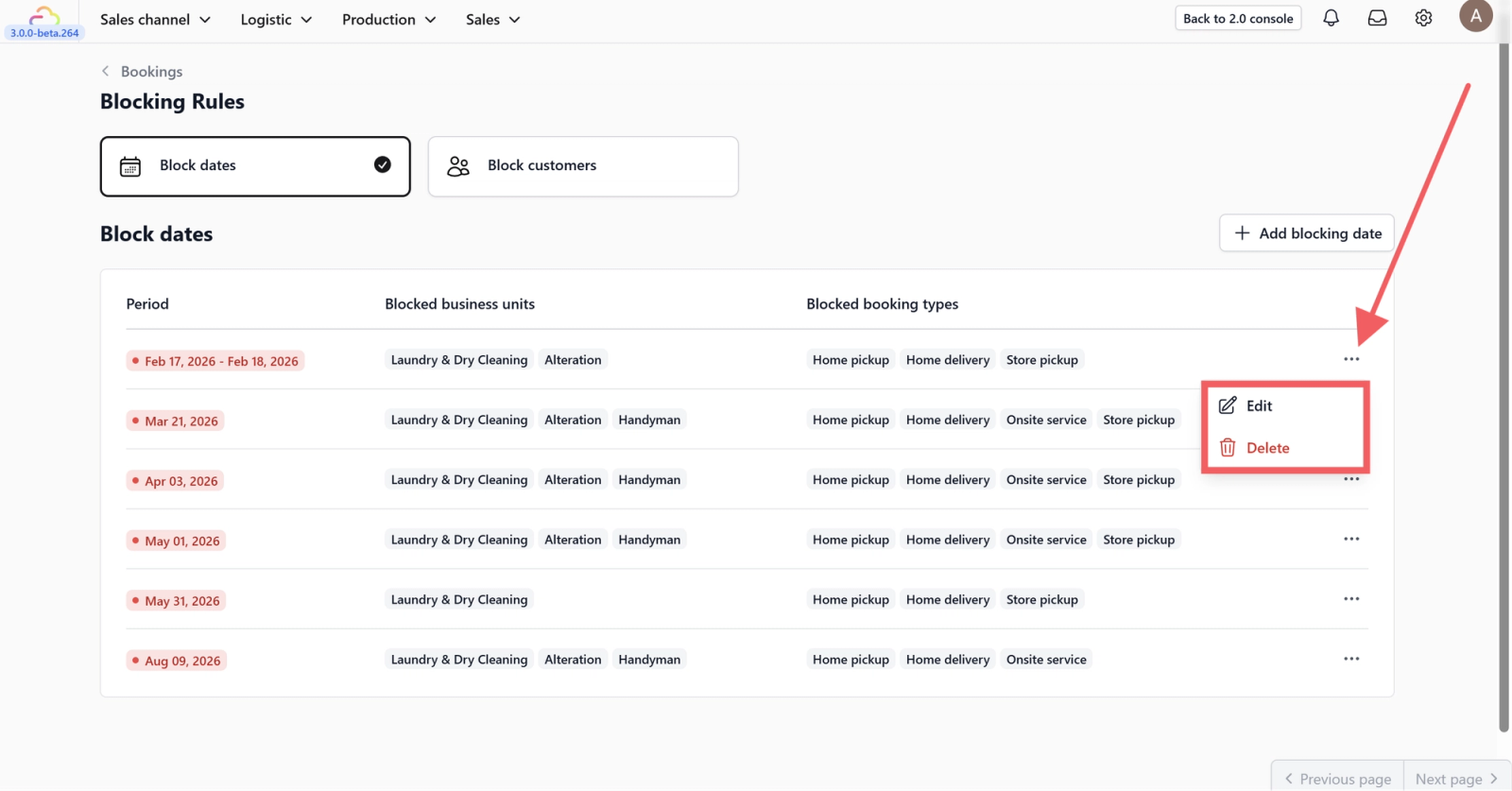 6. Use the three-dot menu to edit or delete an existing blocked date.
