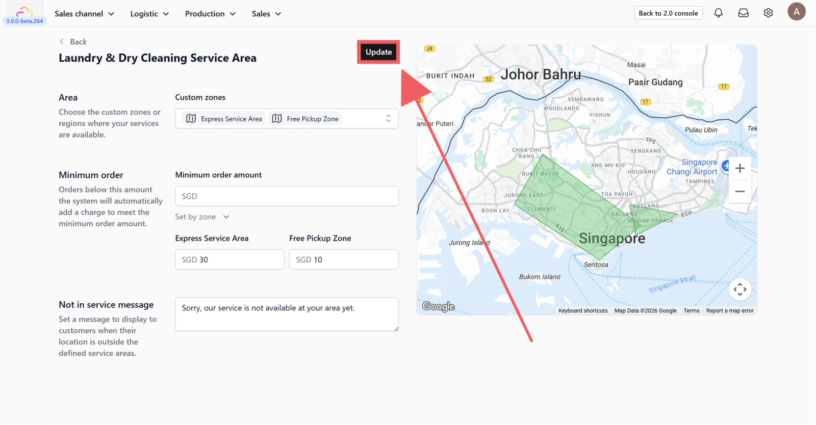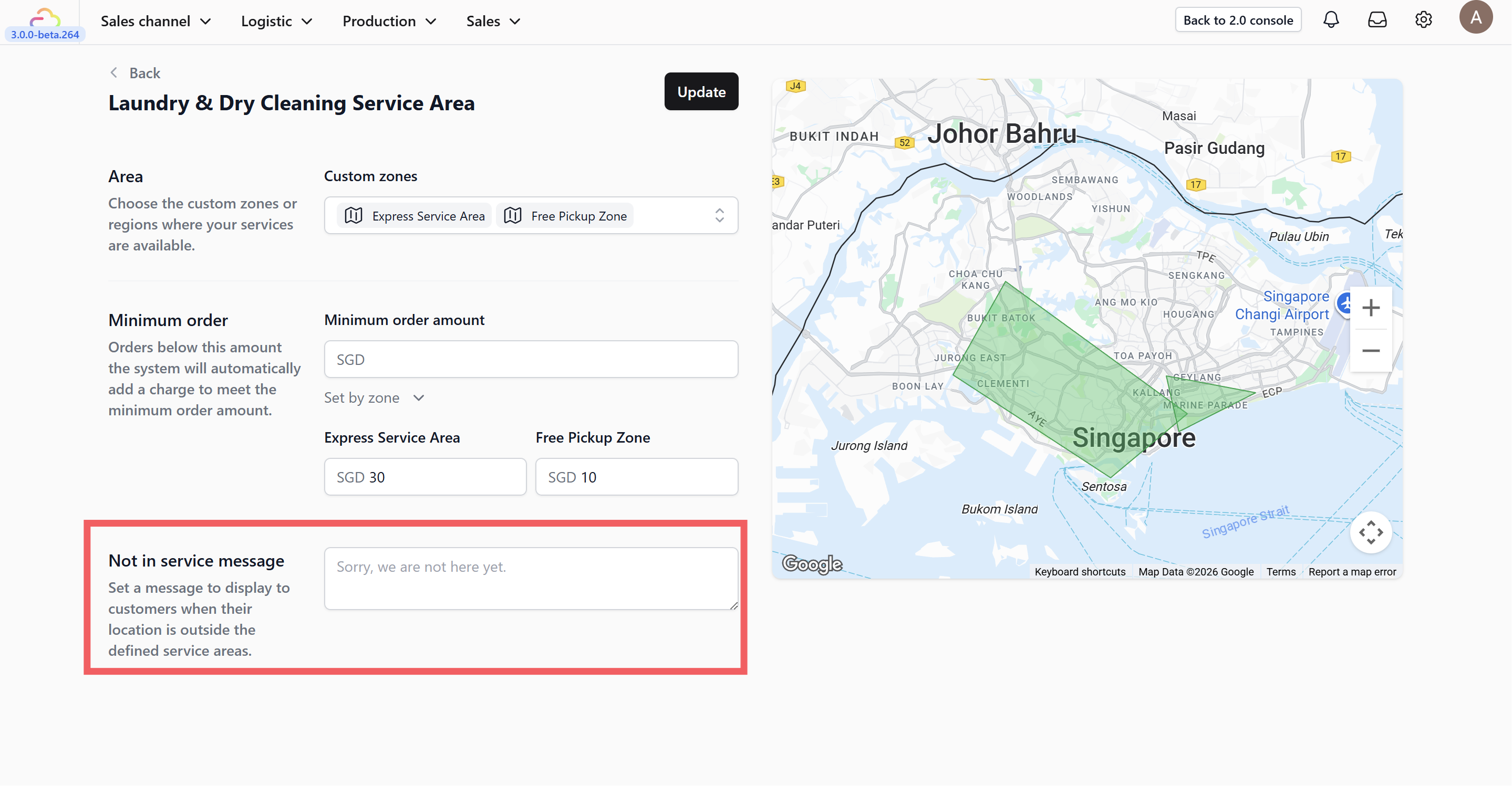5. Under Not in Service Message, add the message that will be displayed to customers whose locations fall outside your service area
