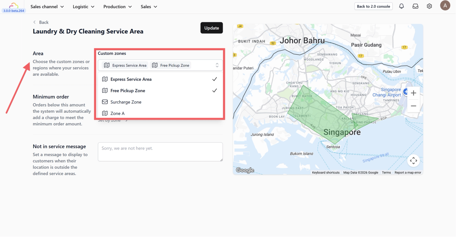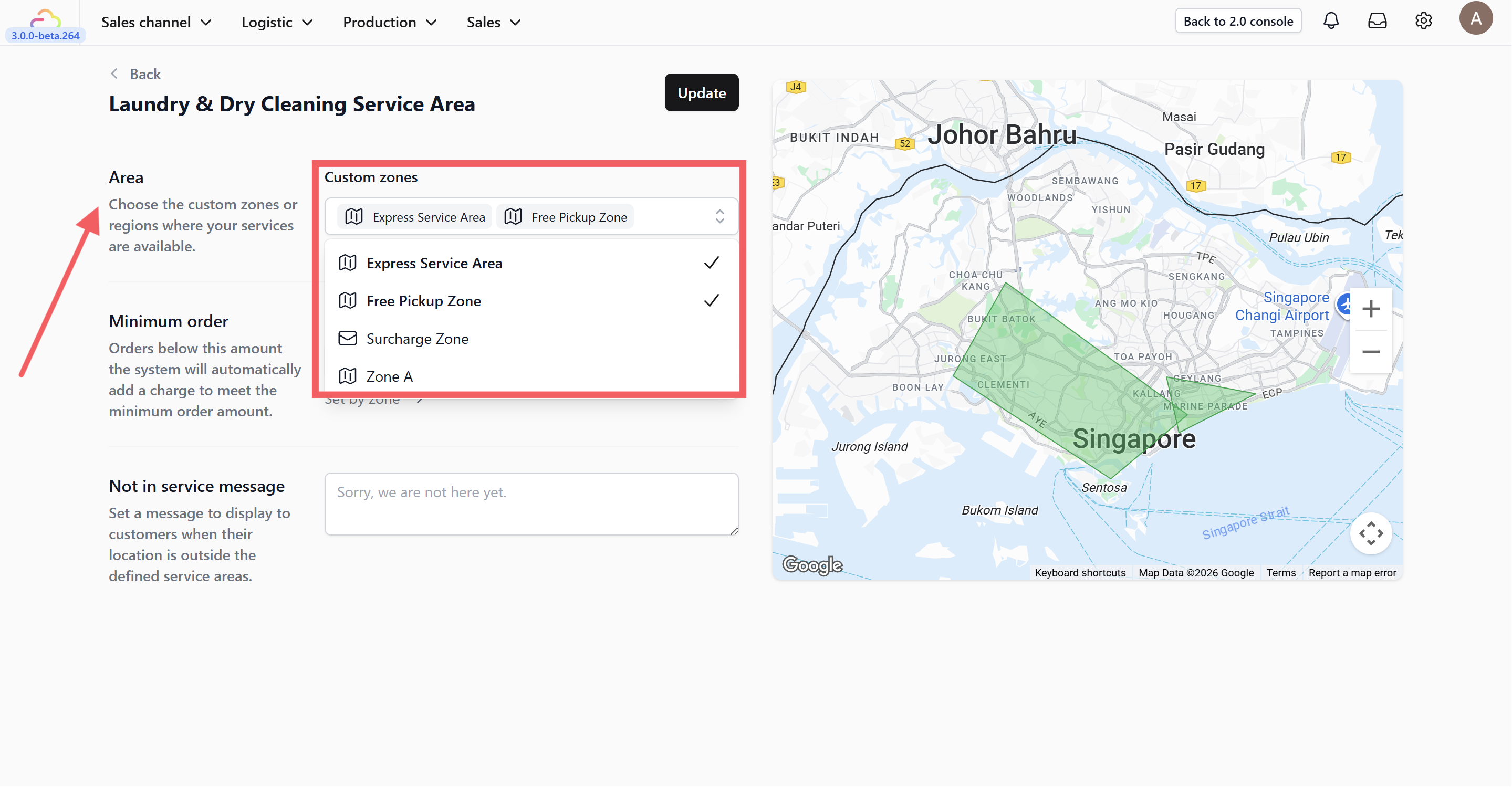 Custom Zones define the geographical boundaries, while Service Areas use those zones to determine where bookings are allowed. When setting up a Service Area, you will be able to select from the Custom Zones you have already created.