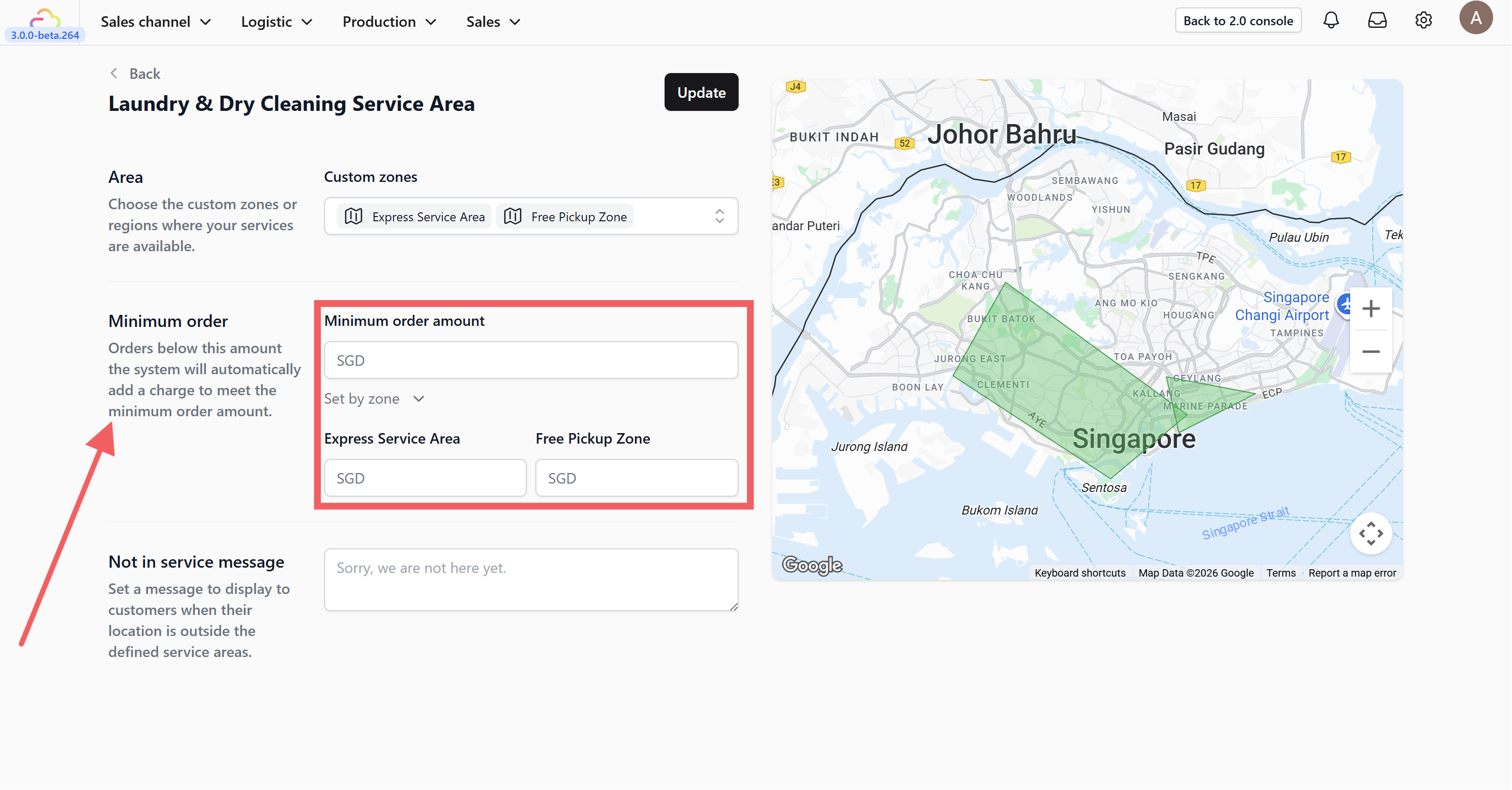 4. Under Minimum Order, choose to apply the default amount set in General or set a custom minimum by zone. Enter the required amount