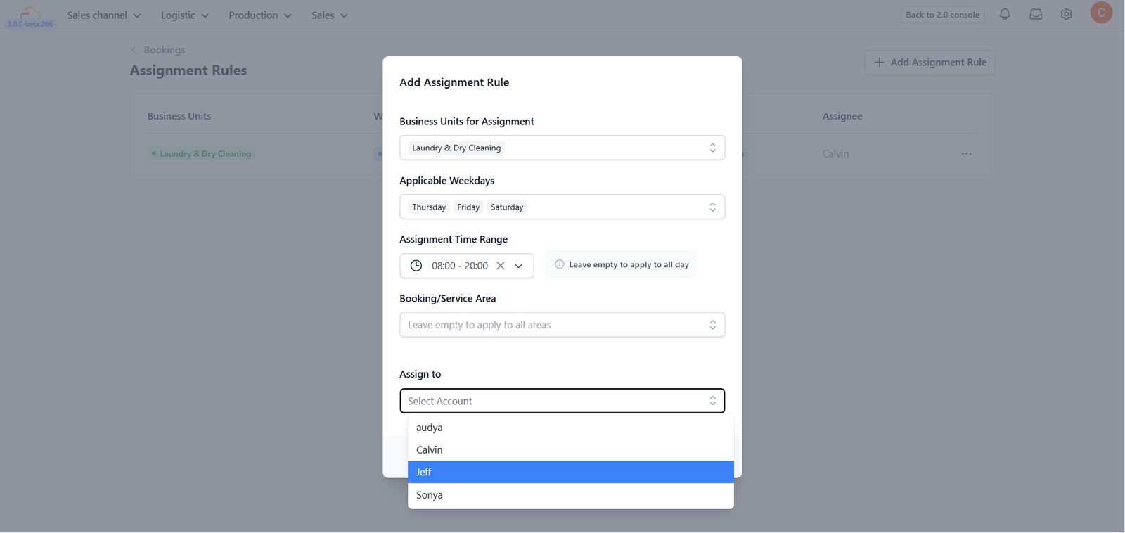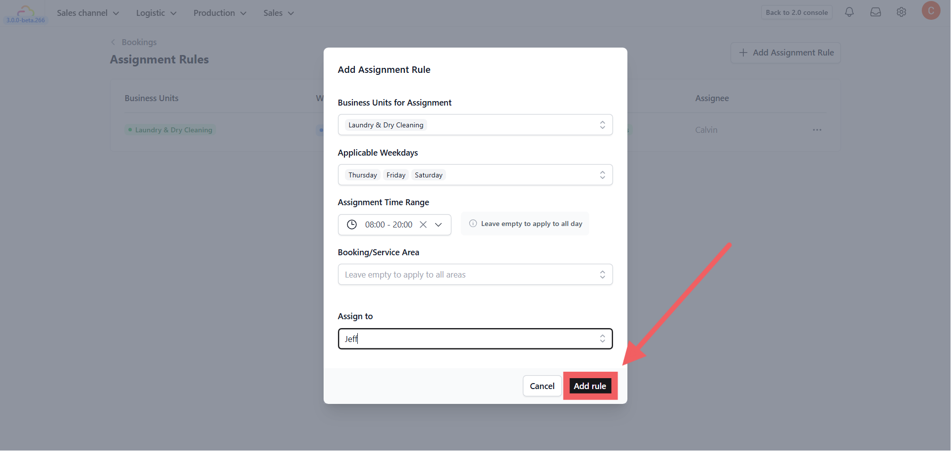 - Booking / Service Area: Select the geographic zone for this rule. If you haven't created these yet, they can be configured in the [Setting Up Service Areas] guide.