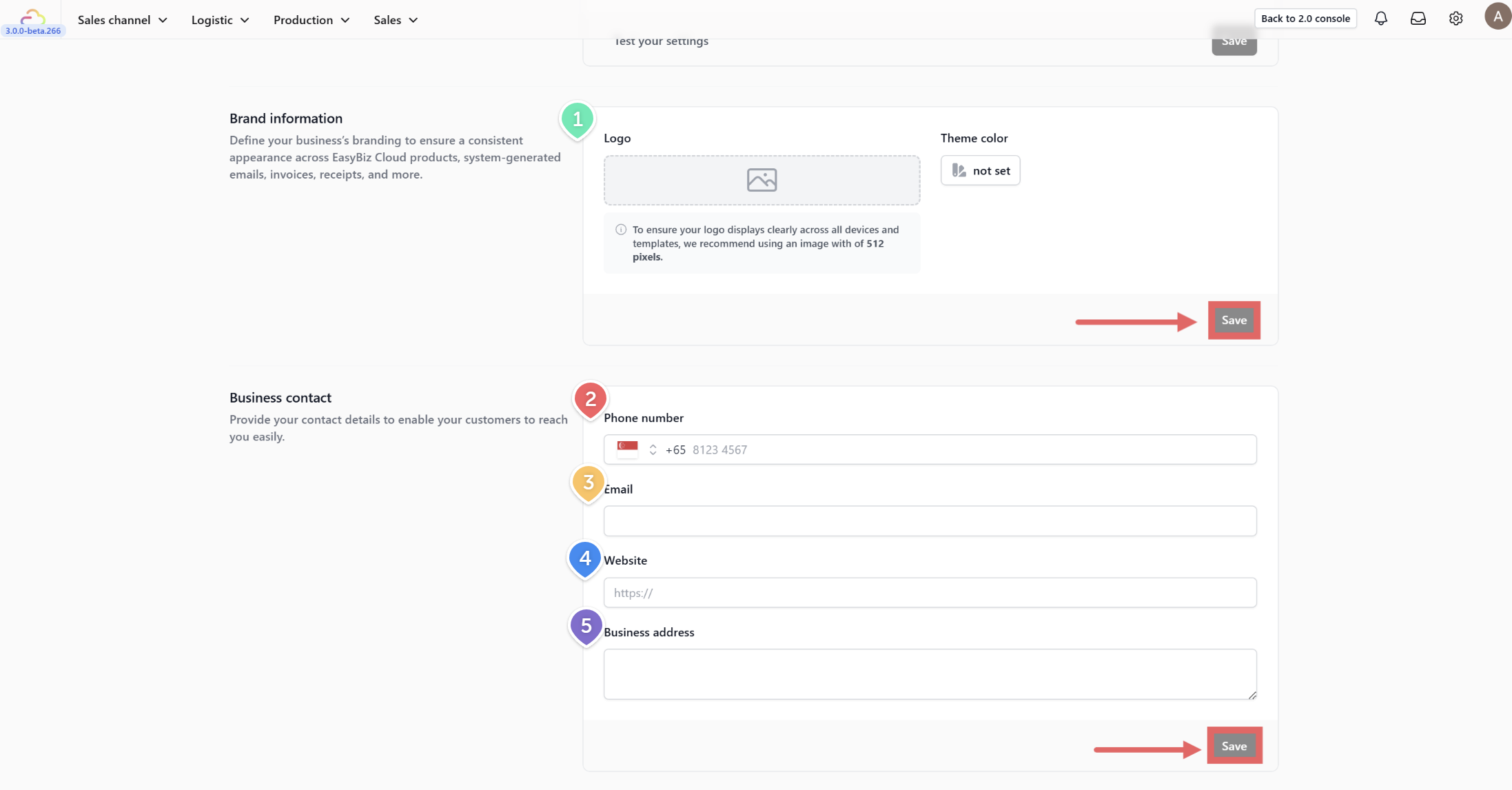 1.Logo: Upload your official business logo. This image will be used on digital receipts, invoices, and potentially on your POS interface. Click Save.