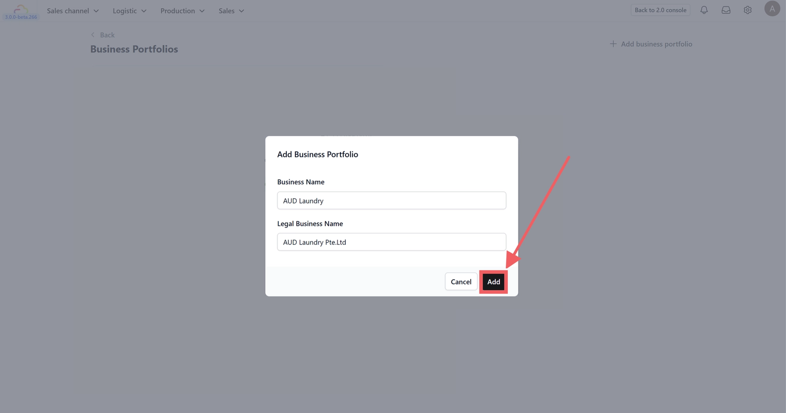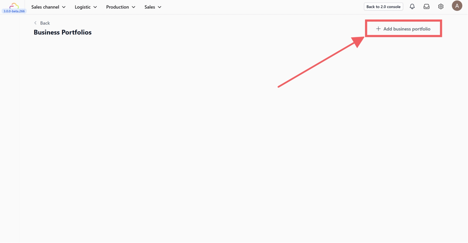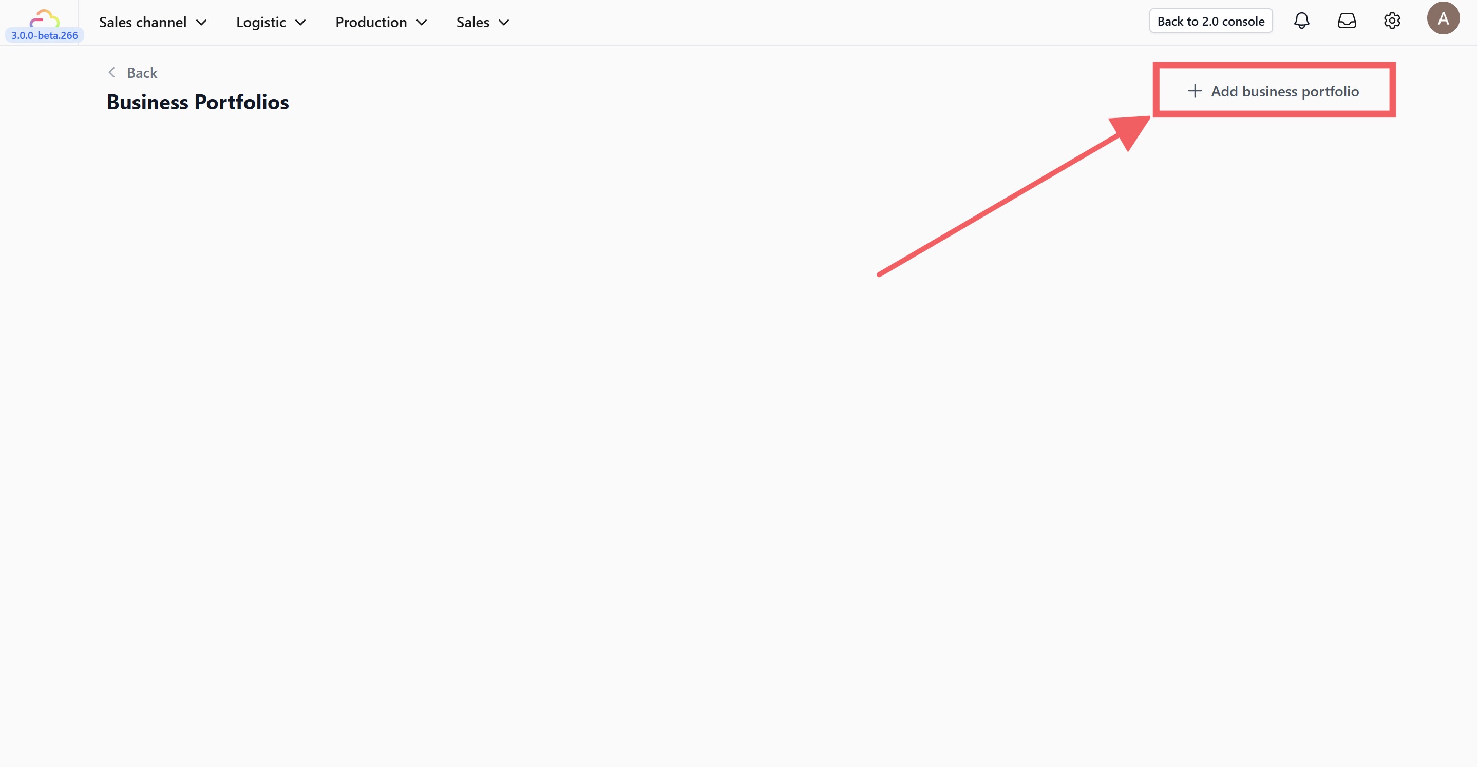 You will enter the Business Portfolios list page. Click the +Add Business Portfolio button in the top right corner.
