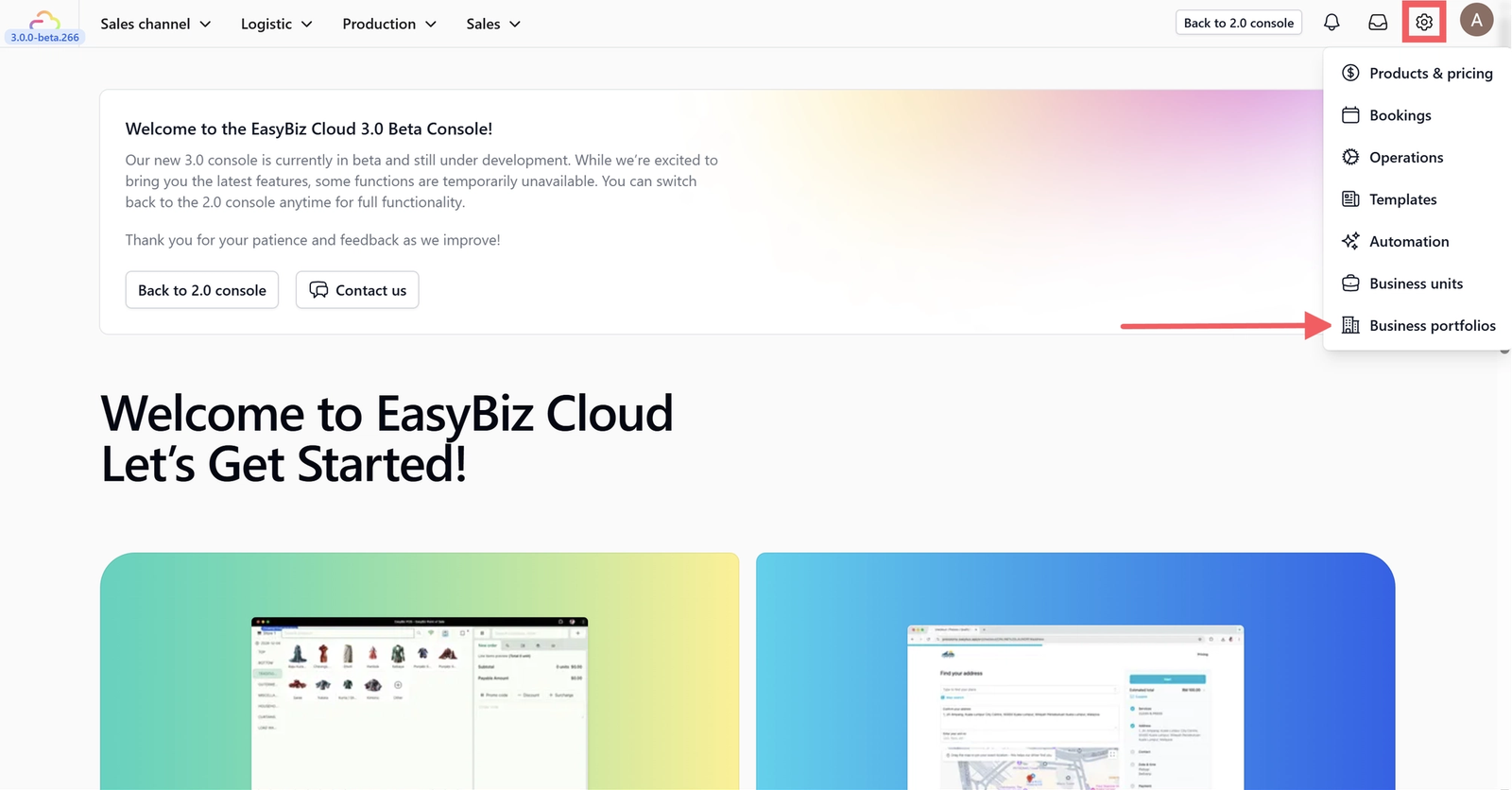 Click on the Settings icon in the main navigation menu and select Business Portfolios.