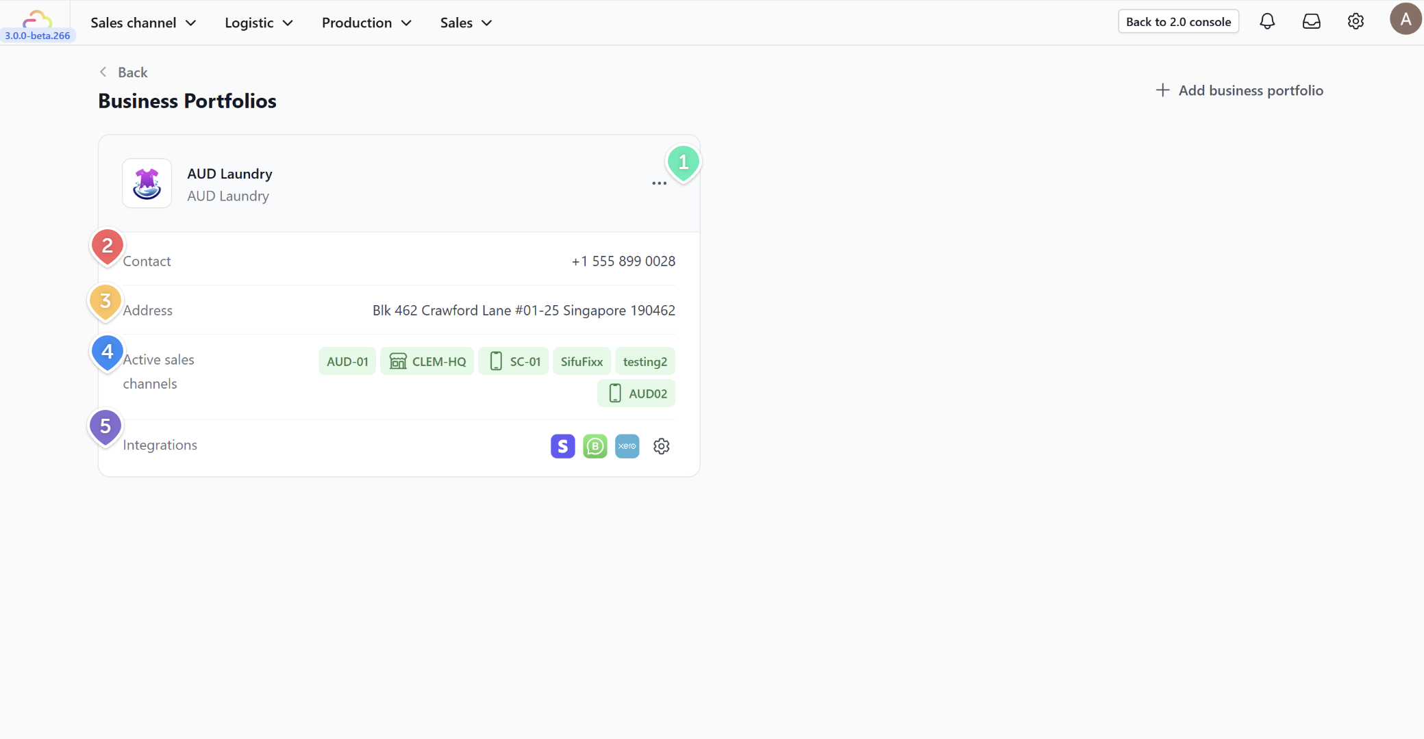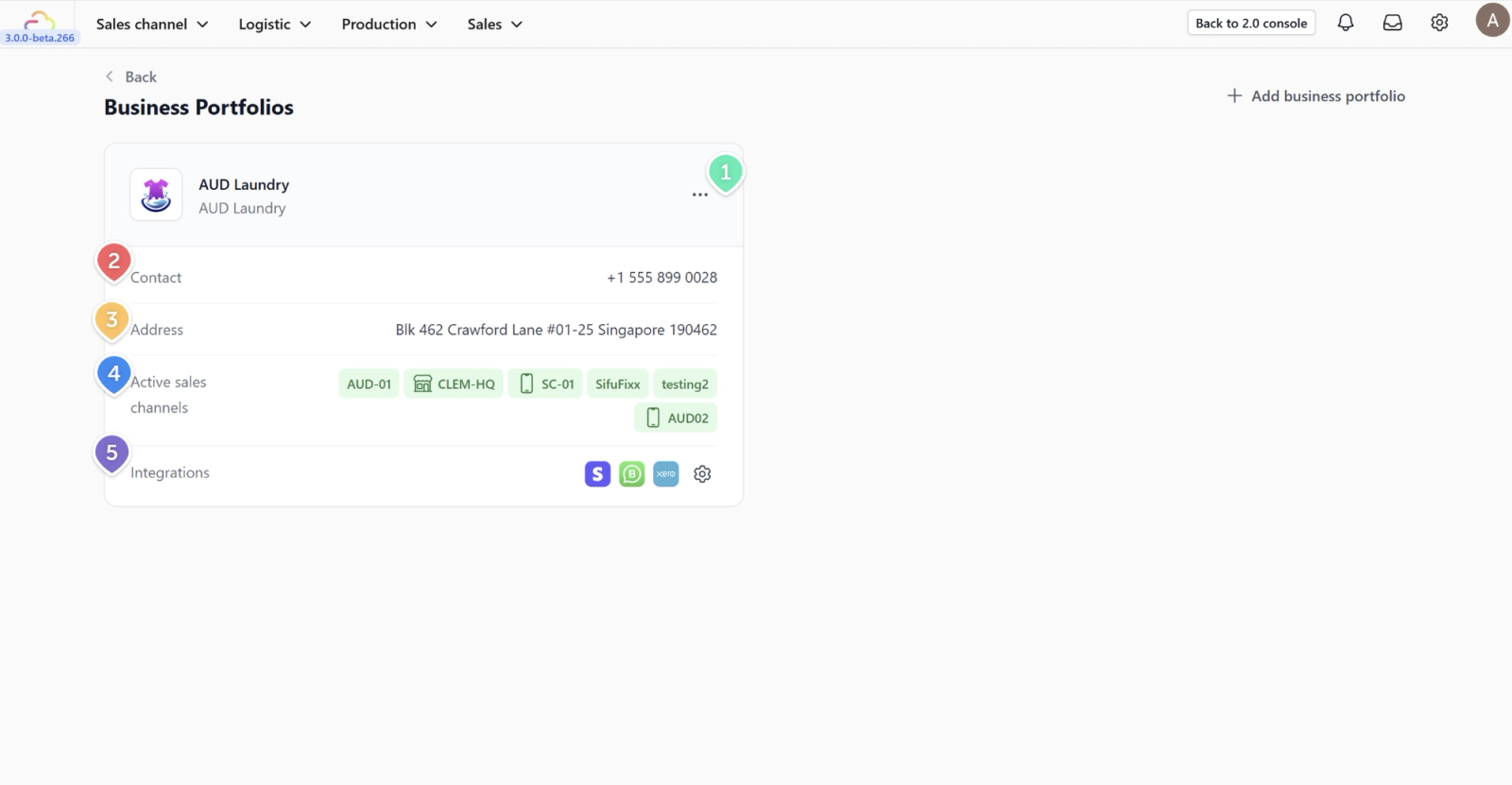 5. Integrations: Displays third-party services connected to this business portfolio.