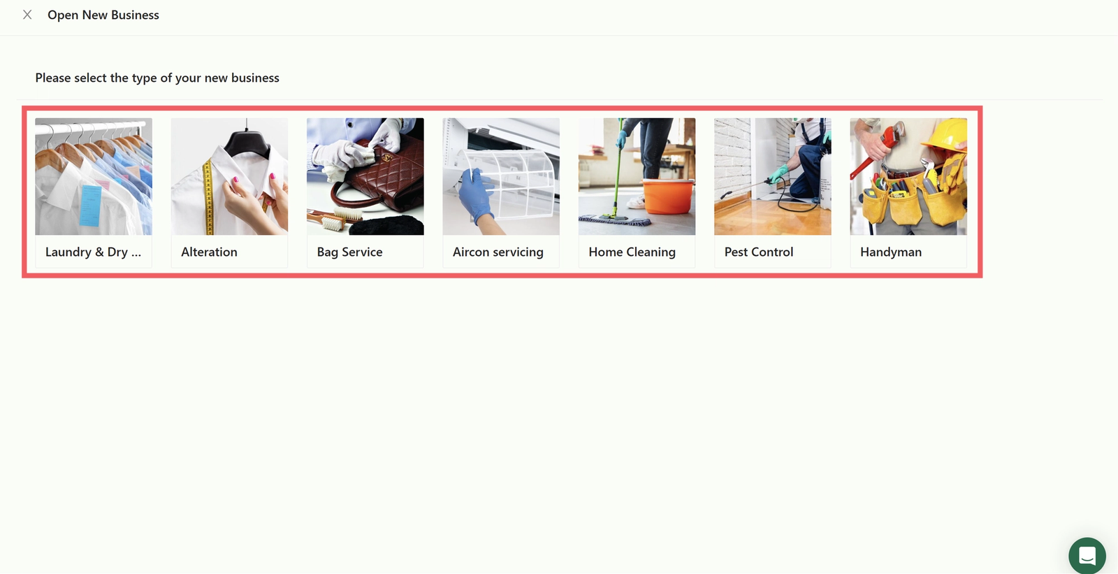 Several business type options will appear; select the service that matches your business needs.