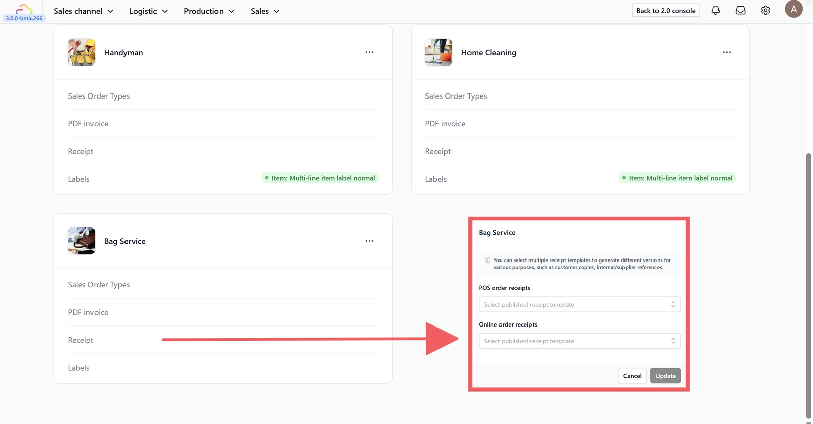 Select the order types for your POS or Online Store. Note that templates must be created before they can be selected.