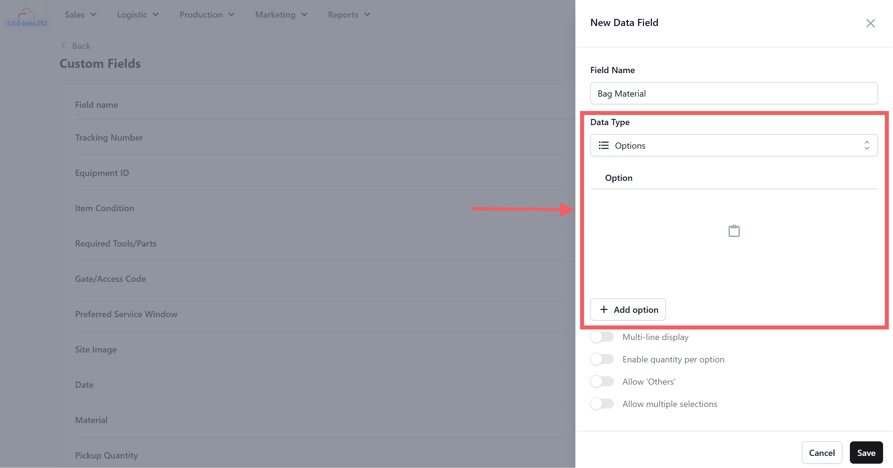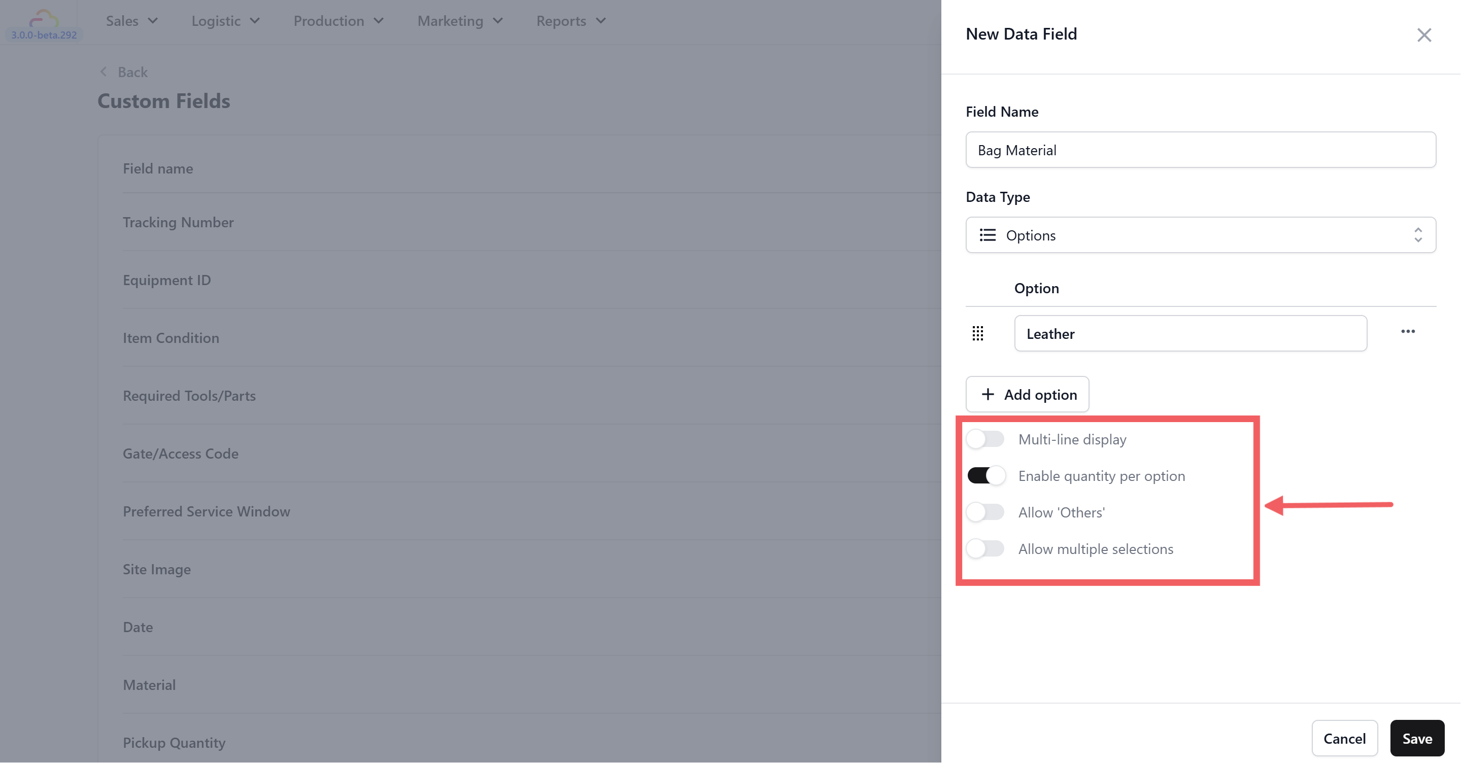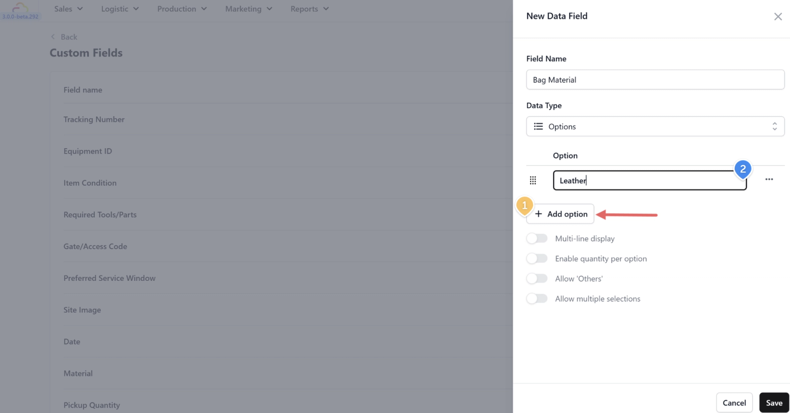 - Allow multiple selections β When turned on, your team can select more than one option at a time. This is useful for fields like Bag Issue where a single bag might have multiple problems β for example, "Broken Zipper" and "Faded Color" and "Torn Lining" all at once.