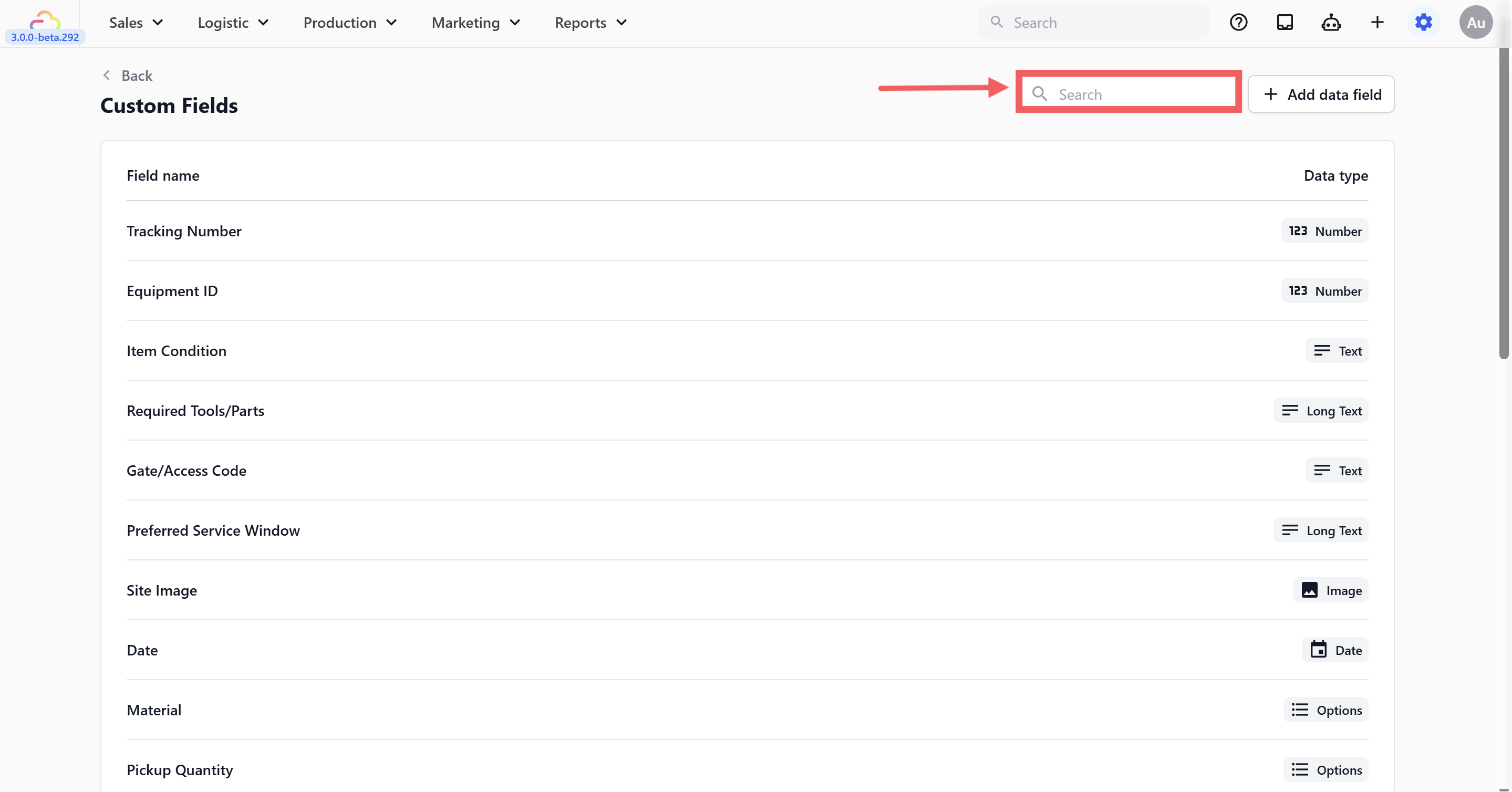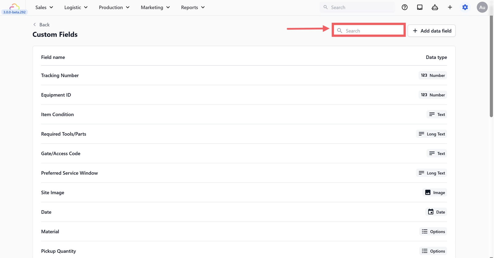Use the search bar at the top of the page to quickly find a specific field. This is especially helpful once your list grows β just type part of the field name (e.g. "bag" to find all bag-related fields).