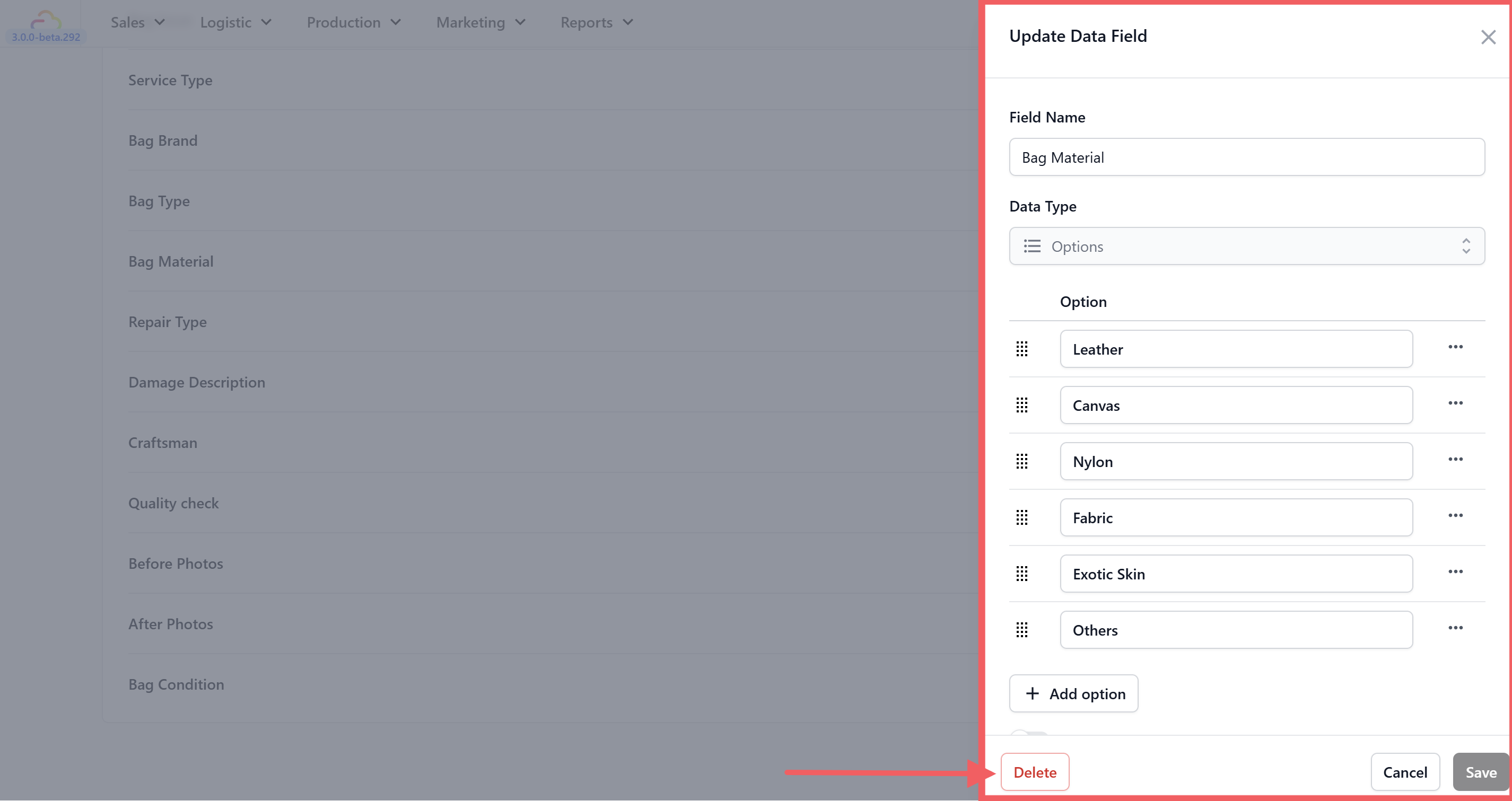 - Allow "Others" β When turned on, an extra free-text field appears at the end of the options list. This lets your team type in a value that isn't on your predefined list. Useful for fields like Bag Brand where you can't list every brand β your staff picks from common ones but can type in a rare brand when needed.