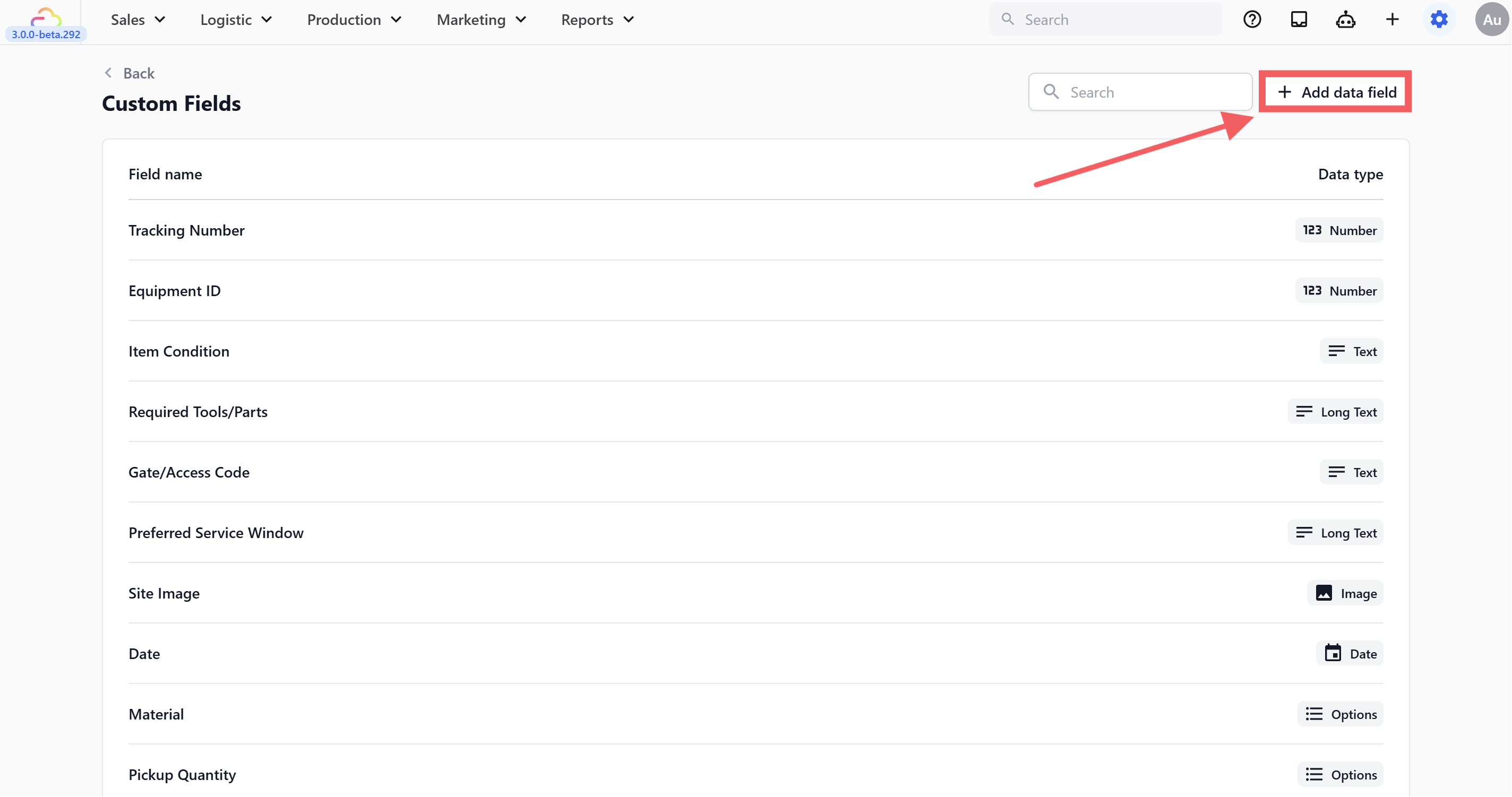 Click the + Add data field button in the top right.