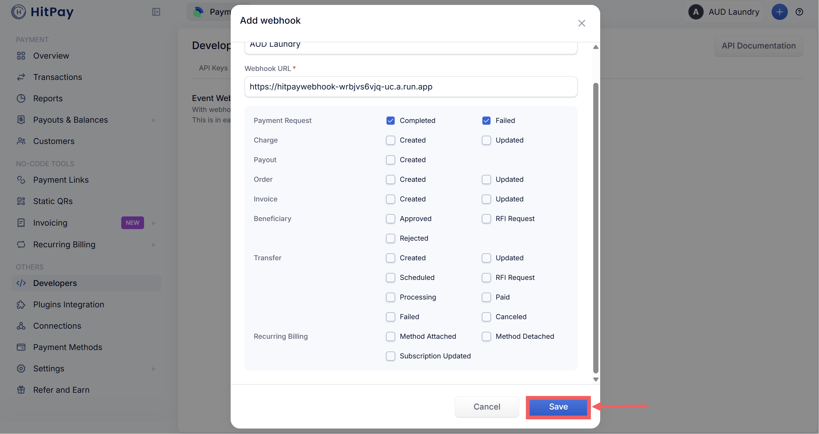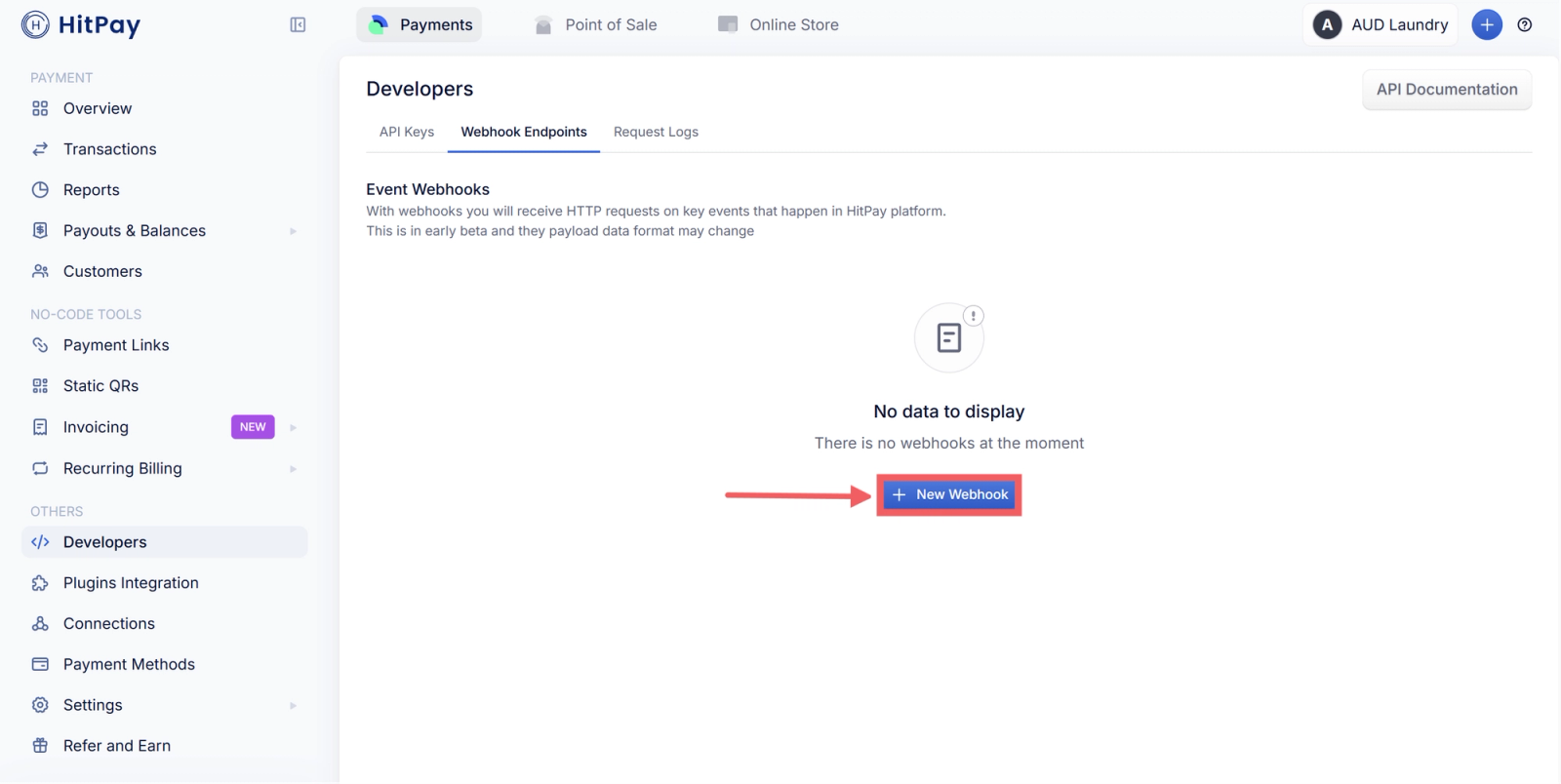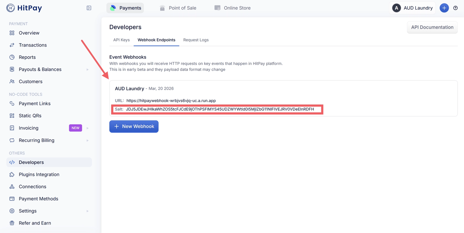 - In your HitPay dashboard, click Developers → Webhook Endpoints tab