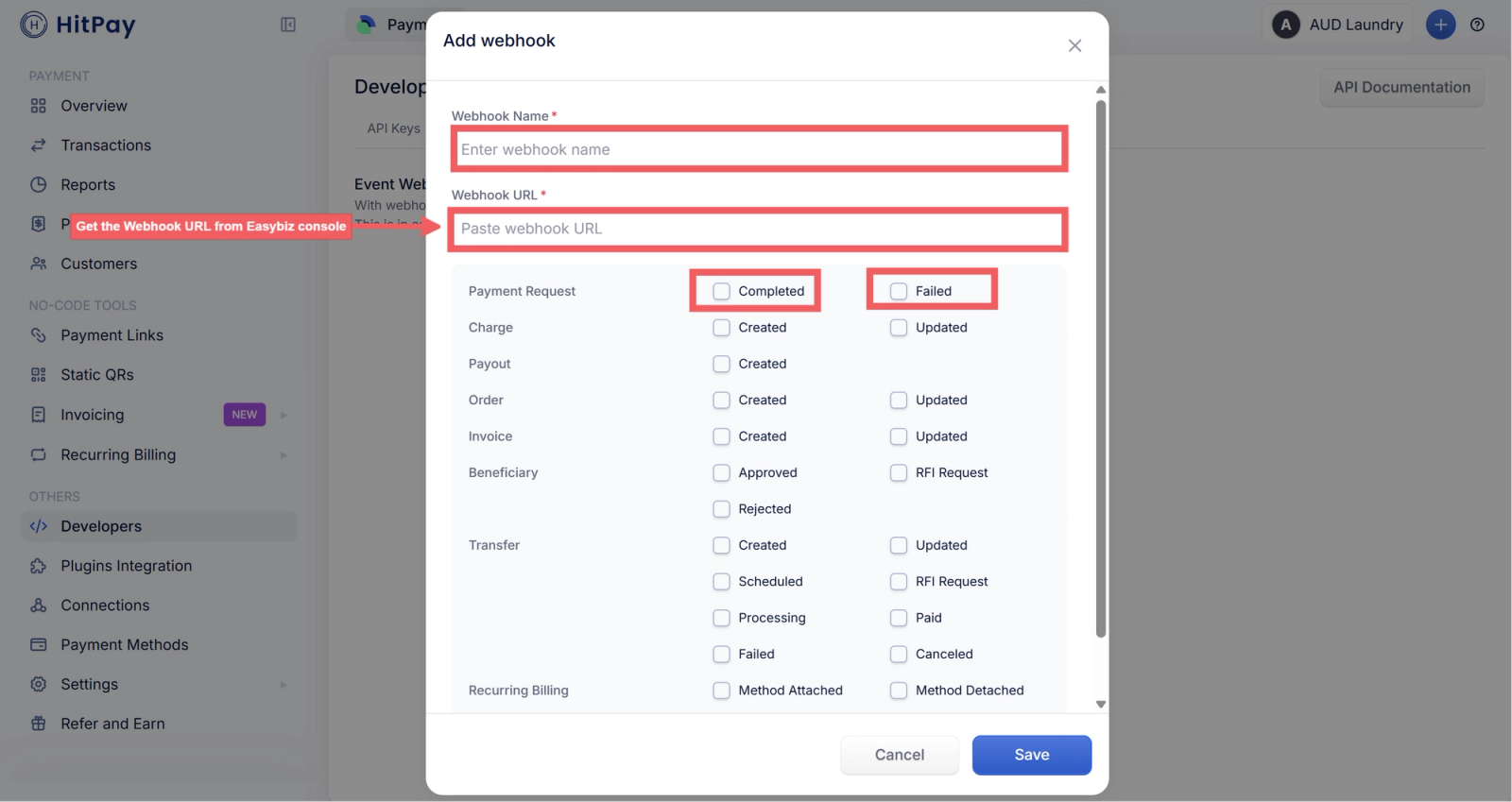 A webhook is how HitPay notifies EasyBiz when a payment is completed or fails. You need to set this up so EasyBiz knows when a customer has paid.