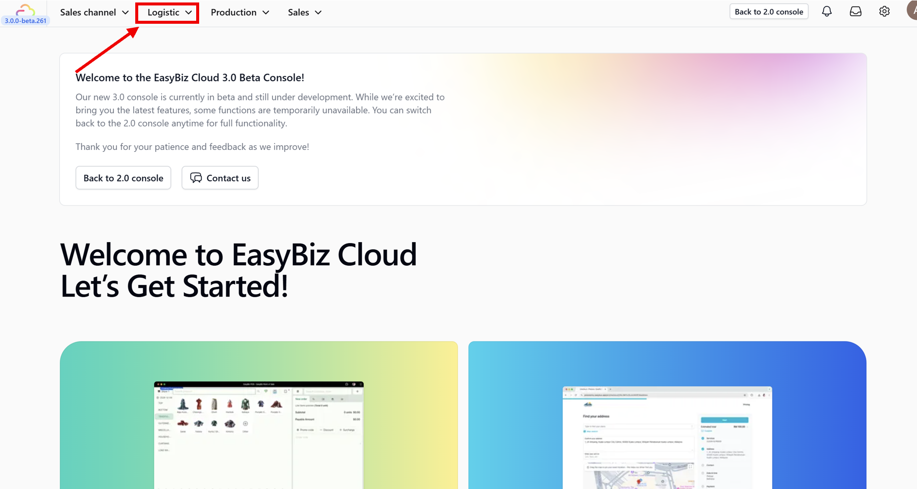 Navigate to your 3.0 console dashboard and click on Logistic in the top navigation bar.