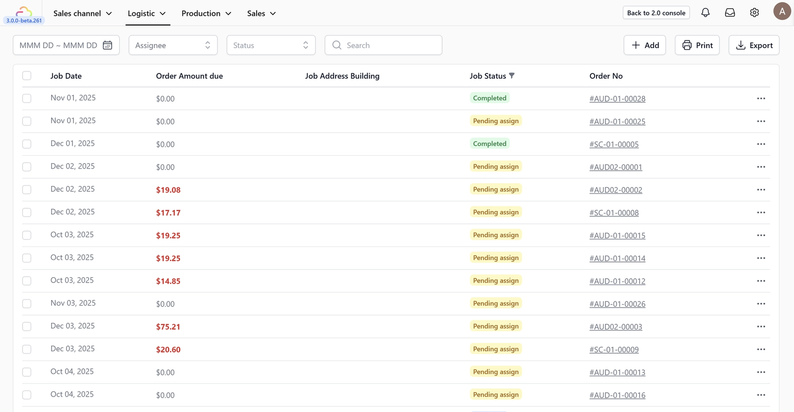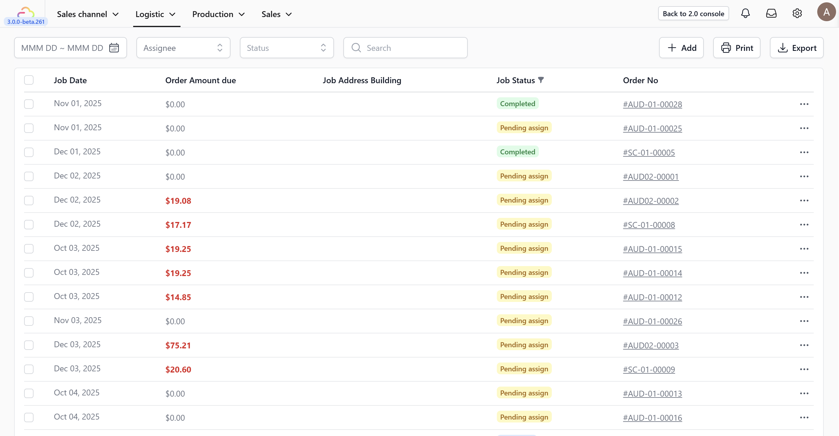 Selecting Job Table will display a detailed list view of your jobs, including information such as job dates, statuses, order amounts, and order numbers. (A complete guide on how this works will be shown on the Job Table page).