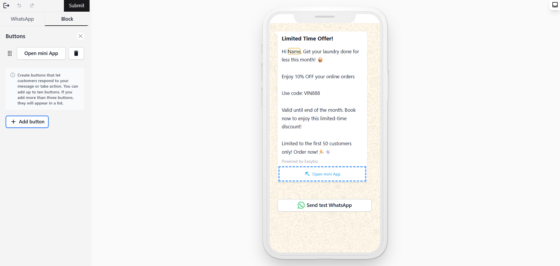 This method requires an approved WhatsApp template with a Mini App button. If you haven't created one yet, follow the steps in Creating Message Templates — specifically the Buttons section where you select Open Mini App.