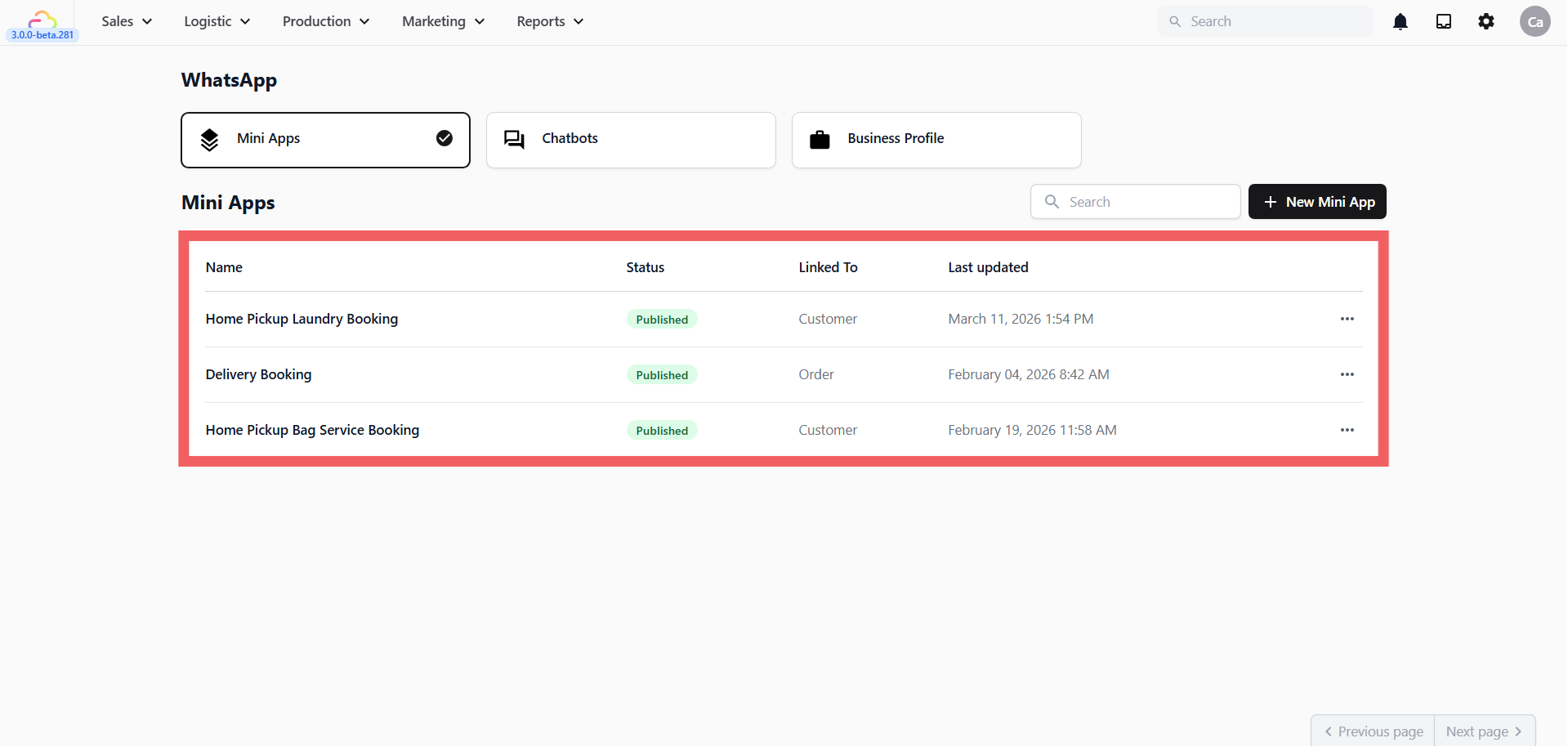 - Go to Settings → Sales Channels → WhatsApp → Mini Apps tab