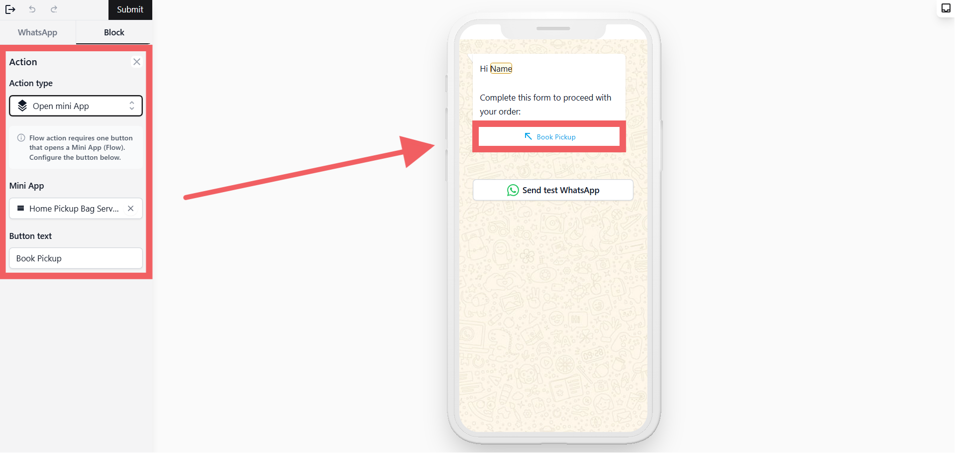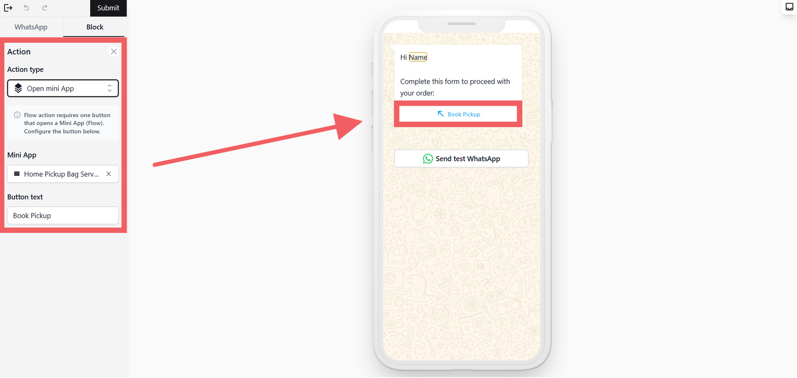 - Under Mini App, select the Mini App you want to link (e.g., Home Pickup Bag Service)