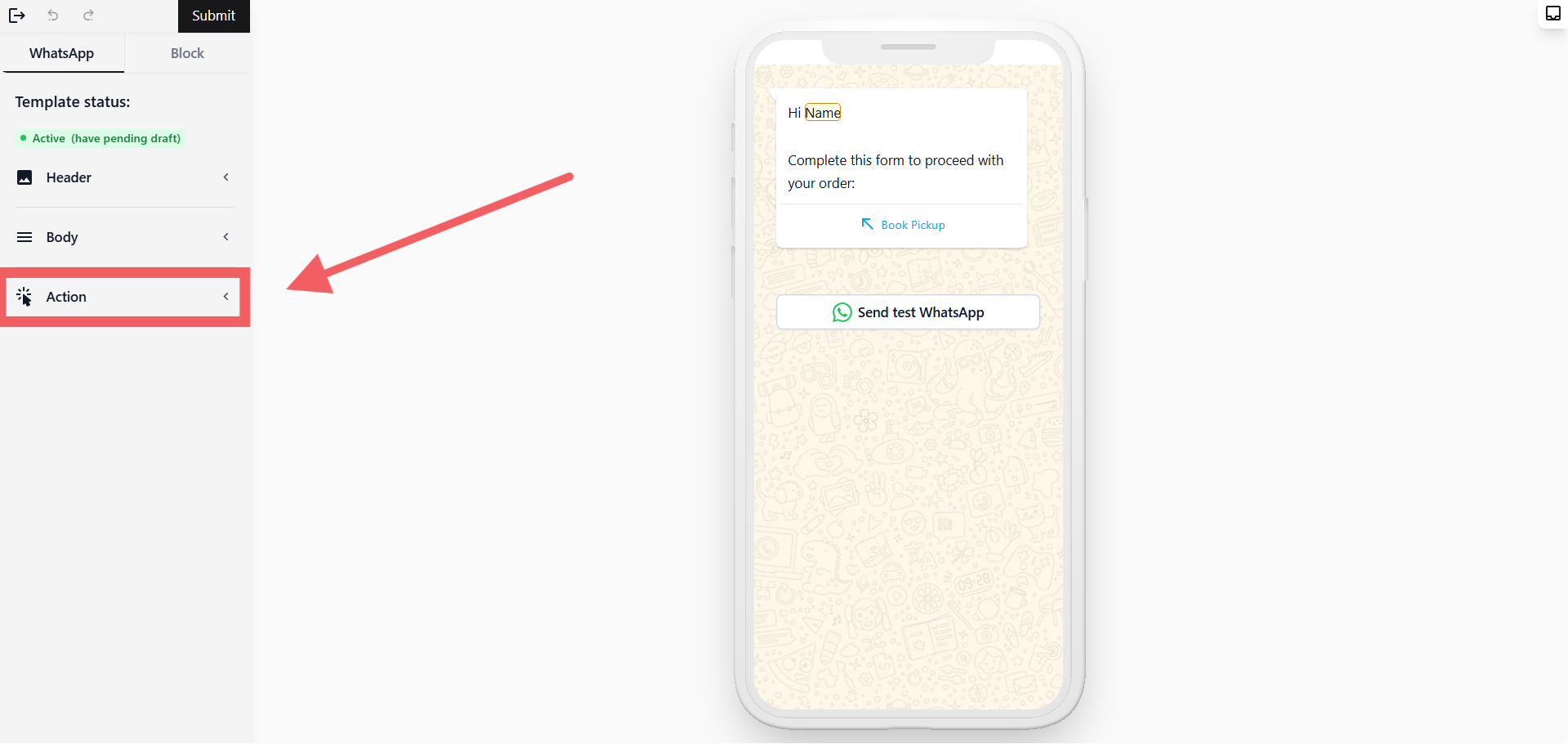 When you reach the template editor, click on the WhatsApp tab and find the Action section to the left of your screen.