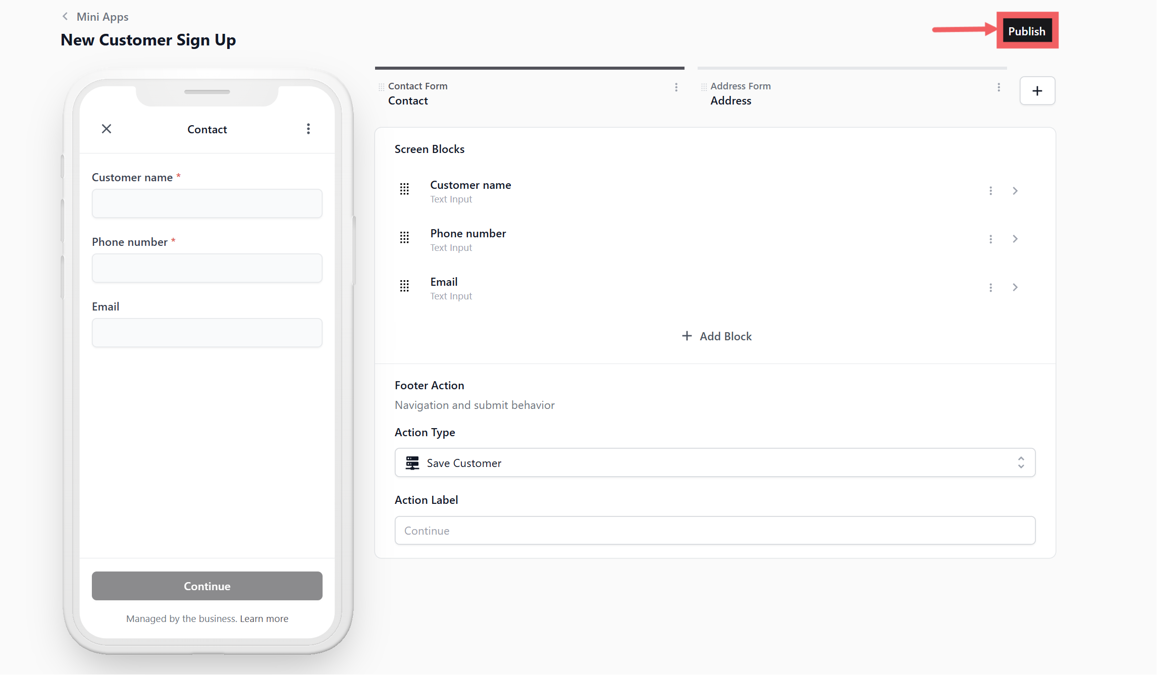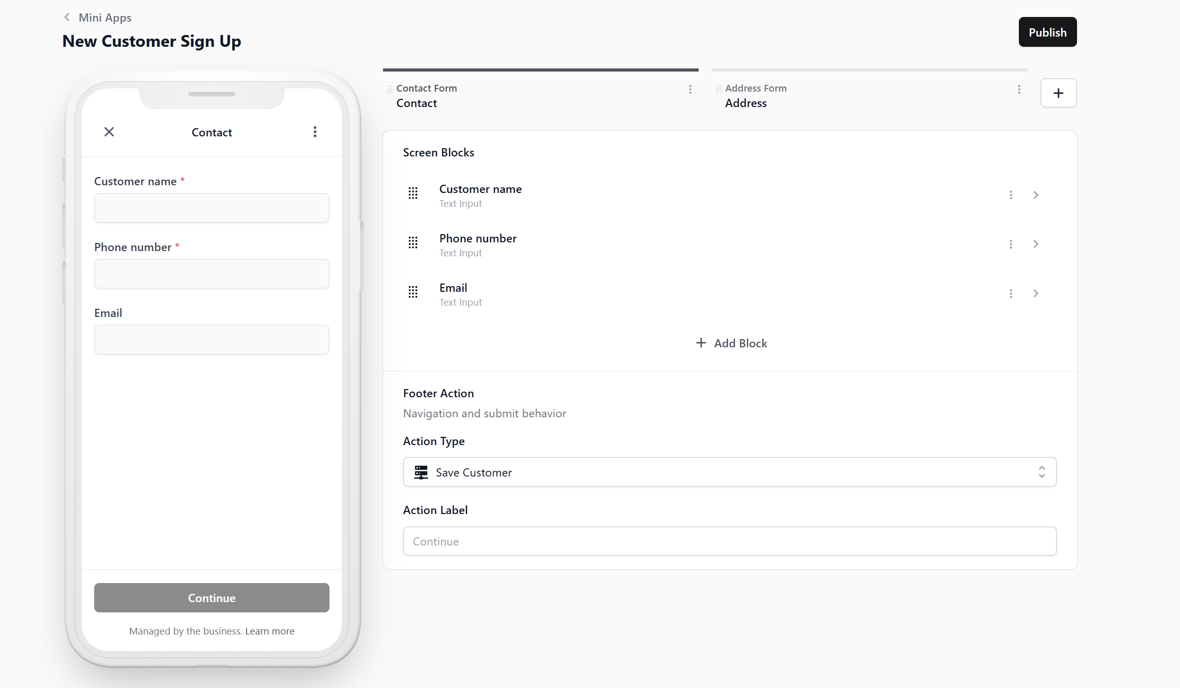 - Back in your Mini App editor, click your Address screen tab.