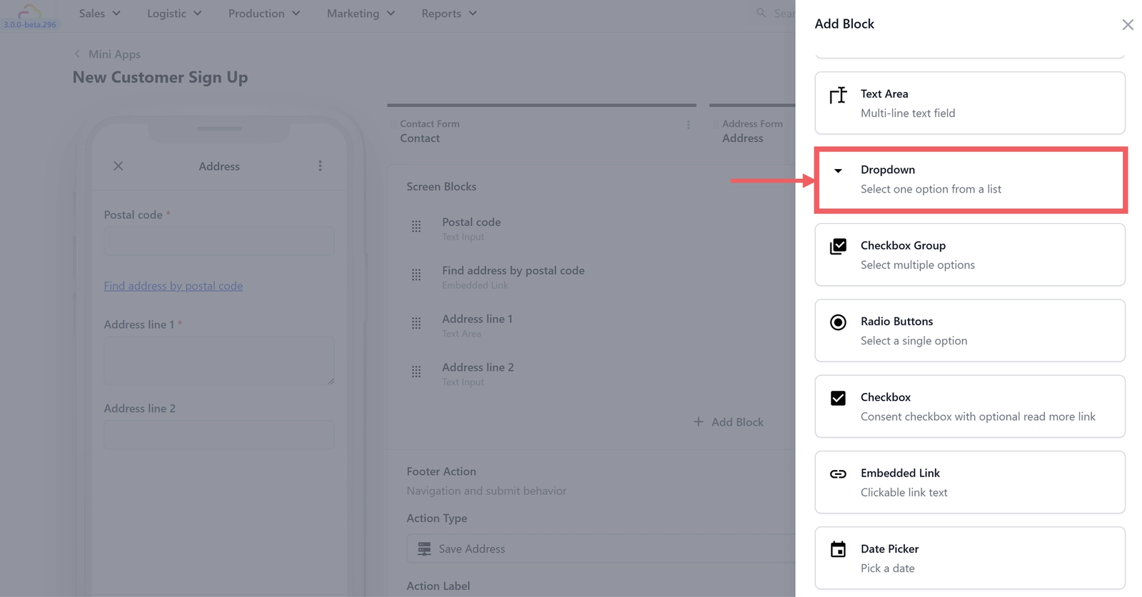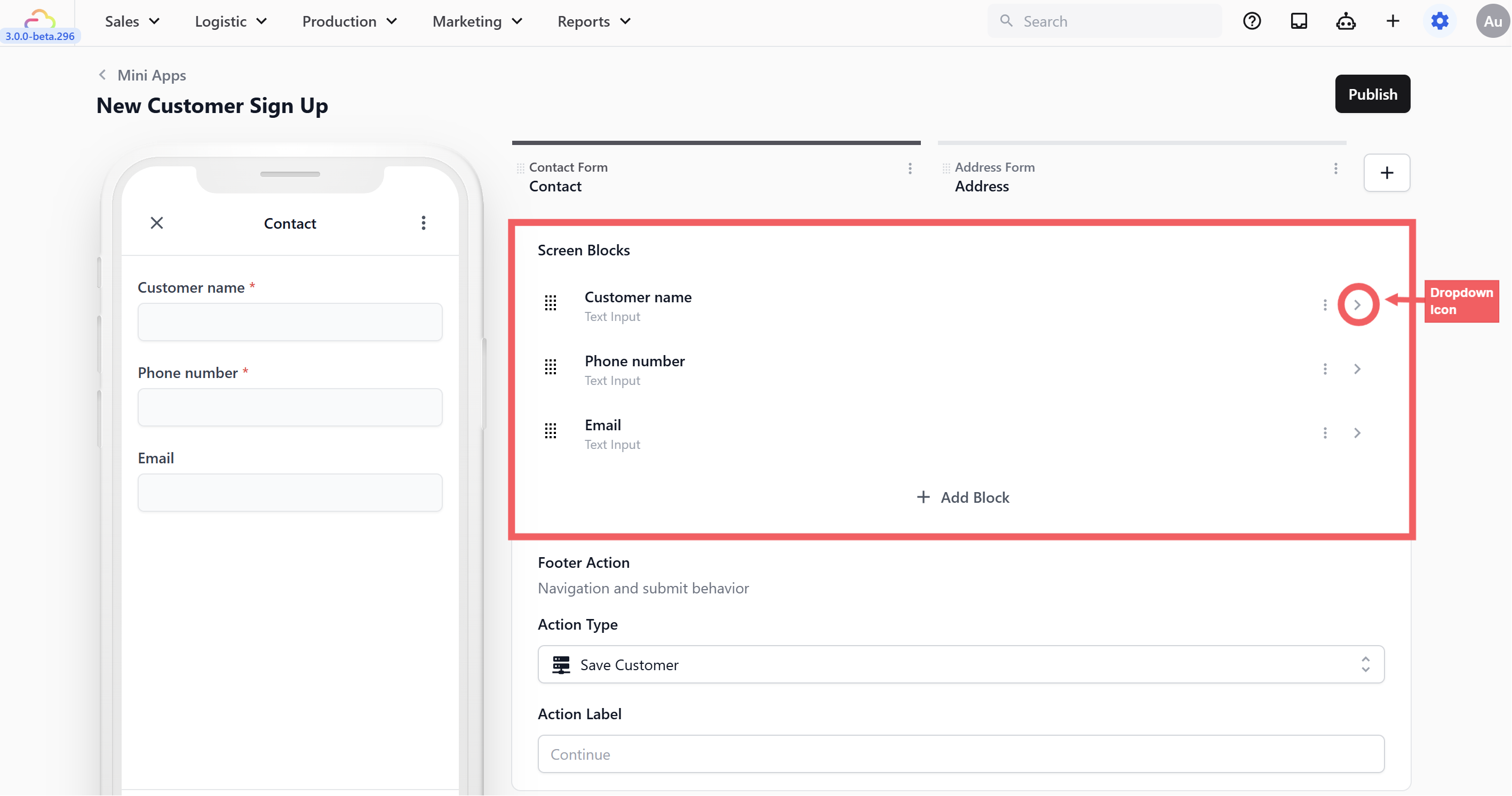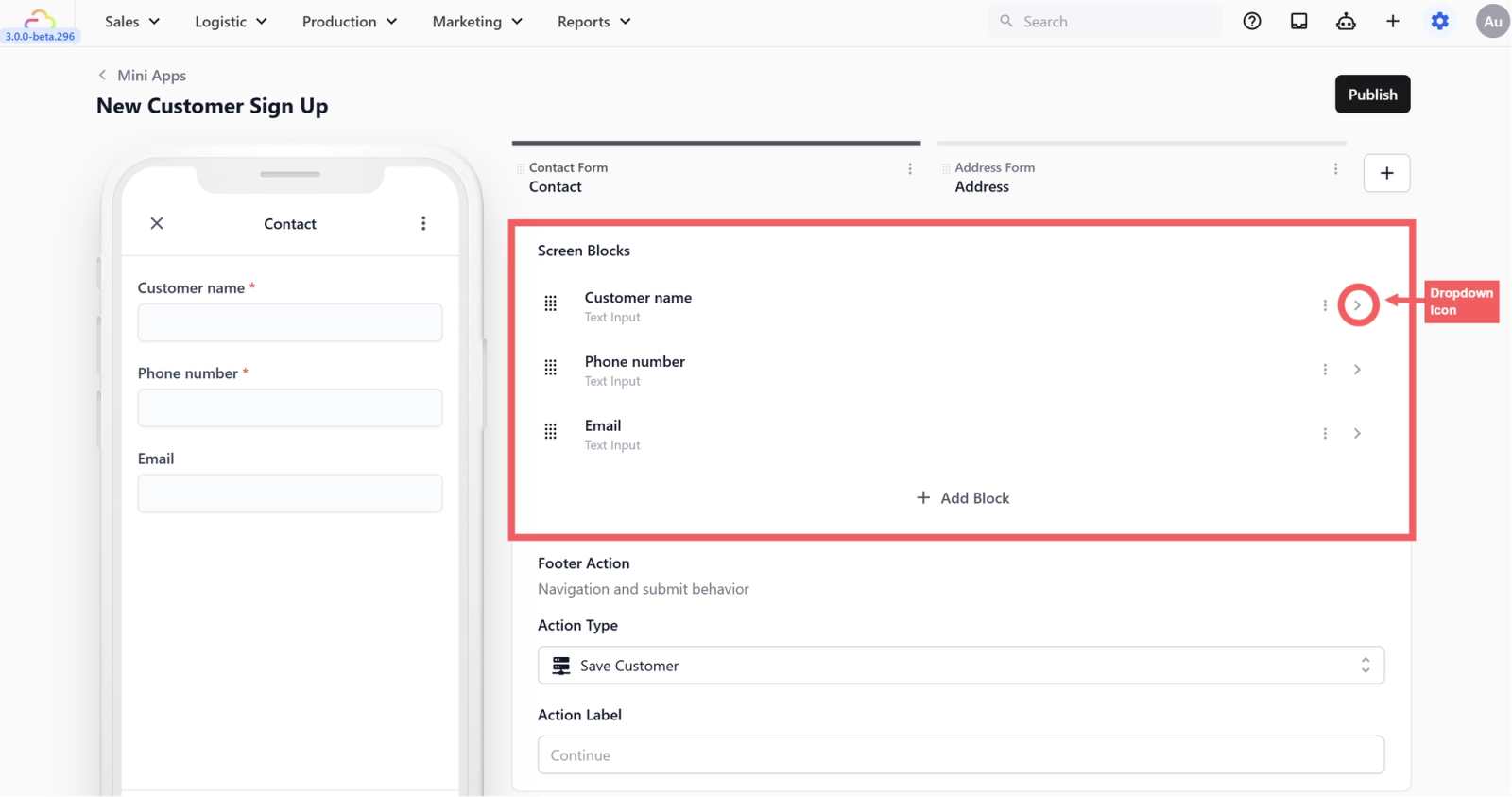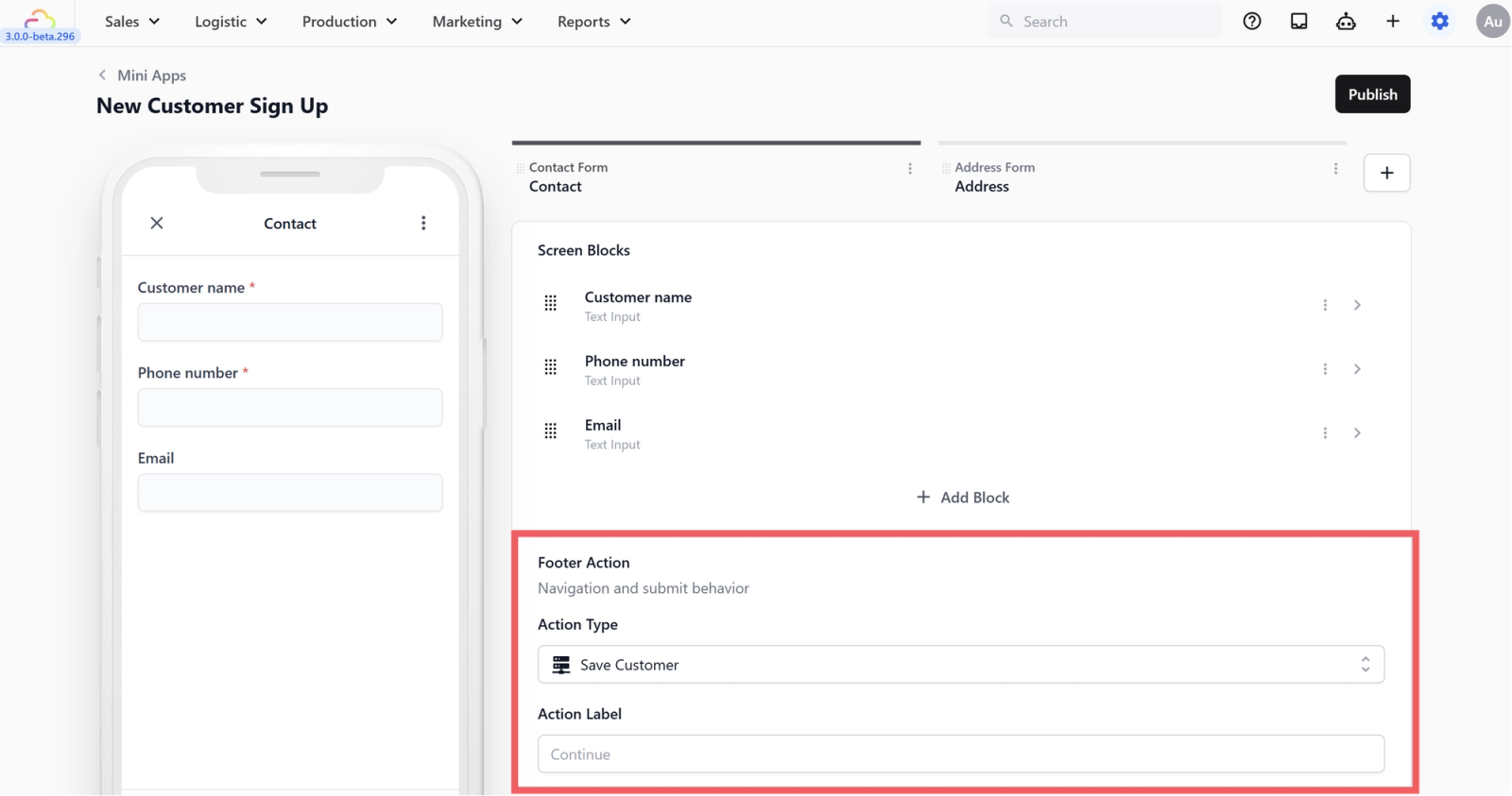 At the very bottom of the editor for each screen, you will see a Footer Action. This controls what the button at the bottom of the customer's phone does when they tap it. It might tell the app to save the customer's details, move to the next page, or finally create the order.
