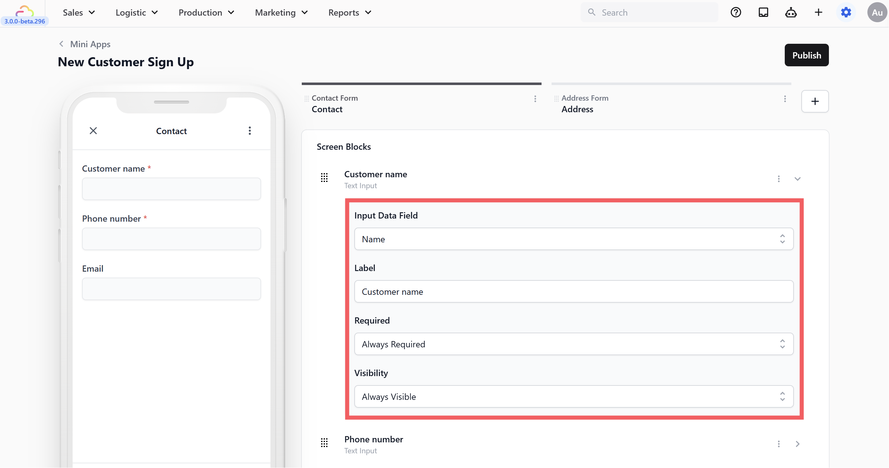 When you open your Mini App, you will see the screen is divided into two parts to make editing easy. The Left Side (Live Preview) is a preview of a mobile phone showing exactly what your customers will see. The Right Side (Editor Tabs) is where you control your form. At the top, you will see tabs for your screens (like pages in a book). You can drag and drop these tabs to reorder your pages.